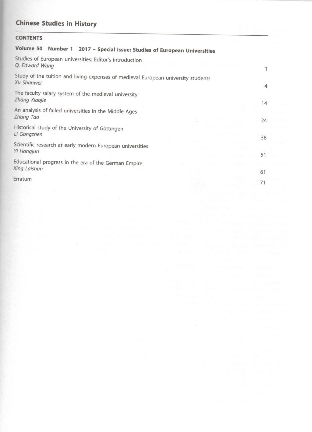 日前,英文学术期刊Chinese Studies in History(《中国历史研究》)2017年第1期刊发了我院教育系易红郡教授的学术论文“Scientific research at early modern European universities”(近代早期欧洲大学中的科学研究)。Chinese Studies in History是在美国出版的A&HCI国际检索期刊,在国际学术界有较大影响。它是以译介、发表中文学界重要的历史学研究成果为宗旨的英文学术期刊(A&HCI Journal),每年4期(季刊)、每期6篇,由国际出版商Routledge Taylor & Francis出版。