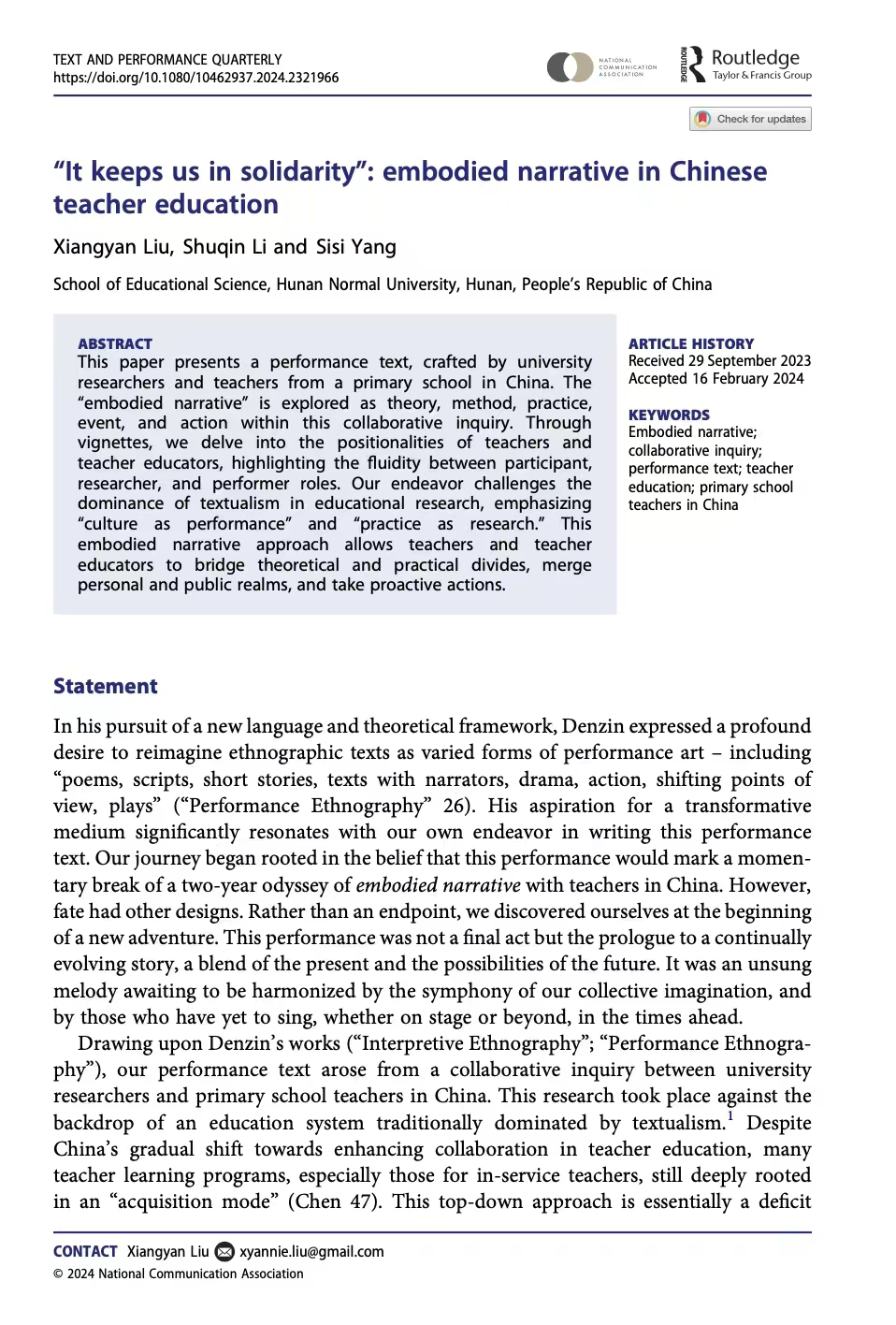 近日,湖南师范大学教育科学学院刘湘燕老师所在项目组,在国际期刊Text and Performance Quarterly(JCR人文艺术类A&HCI收录分区Q1)发表了题为“It keeps us in solidarity”:embodied narrative in Chinese teacher education的论文。刘湘燕老师为第一兼通讯作者,2021级课程与教学论方向博士生李书琴和2021级教育学原理方向硕士生杨思思为第二、第三作者。该论文是湖南师范大学教育科学学院教育现象学研究中心的科研成果。