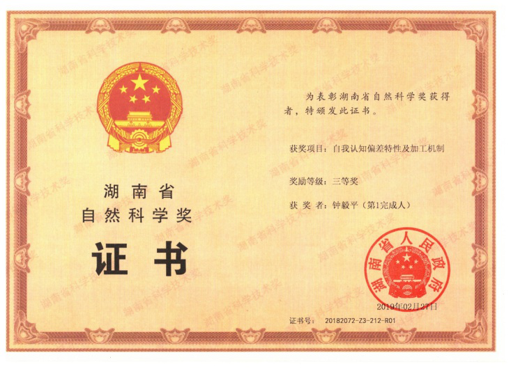 湖南省科技厅科学技术奖办公室根据《湖南省科学技术奖励办法》及实施细则的规定,在2019年度湖南省科学技术奖入选名单中,我校共有6项成果入选,其中我院钟毅平教授团队的研究成果《自我认知偏差特性及加工机制》获湖南省自然科学奖三等奖。据统计,2019年度通过网络初评有115项省自然科学奖、33项省技术发明奖、273项省科学技术进步奖、8项省科学技术创新团队奖。