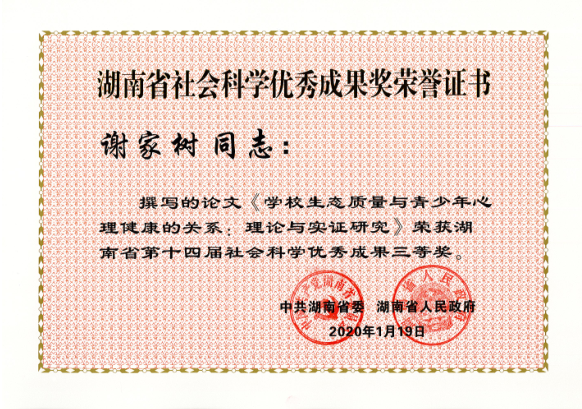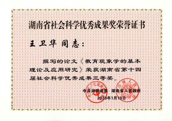 近日,湖南省委、省政府发布了《关于表彰湖南省第十四届社会科学优秀成果、第七届优秀社会科学专家、第五届优秀青年社会科学专家的通报》,此次湖南省社会科学优秀成果奖评出一等奖20项、二等奖50项、三等奖30项,总计100项。我校共32项成果获奖,其中我院有6项成果获奖,分别是:刘铁芳、钟毅平获得一等奖,张楚廷、钟云华获得二等奖,王卫华、谢家树获得三等奖。