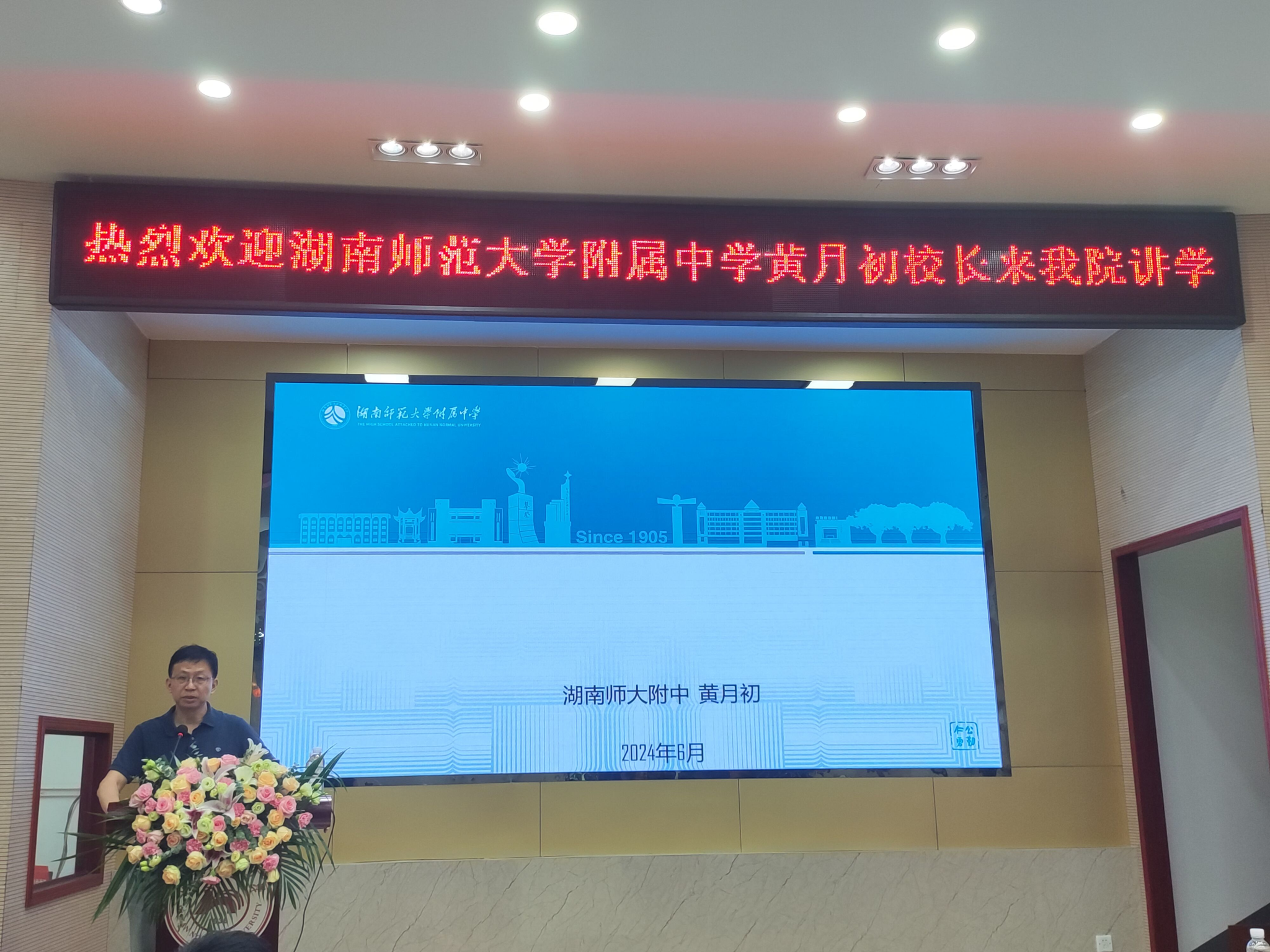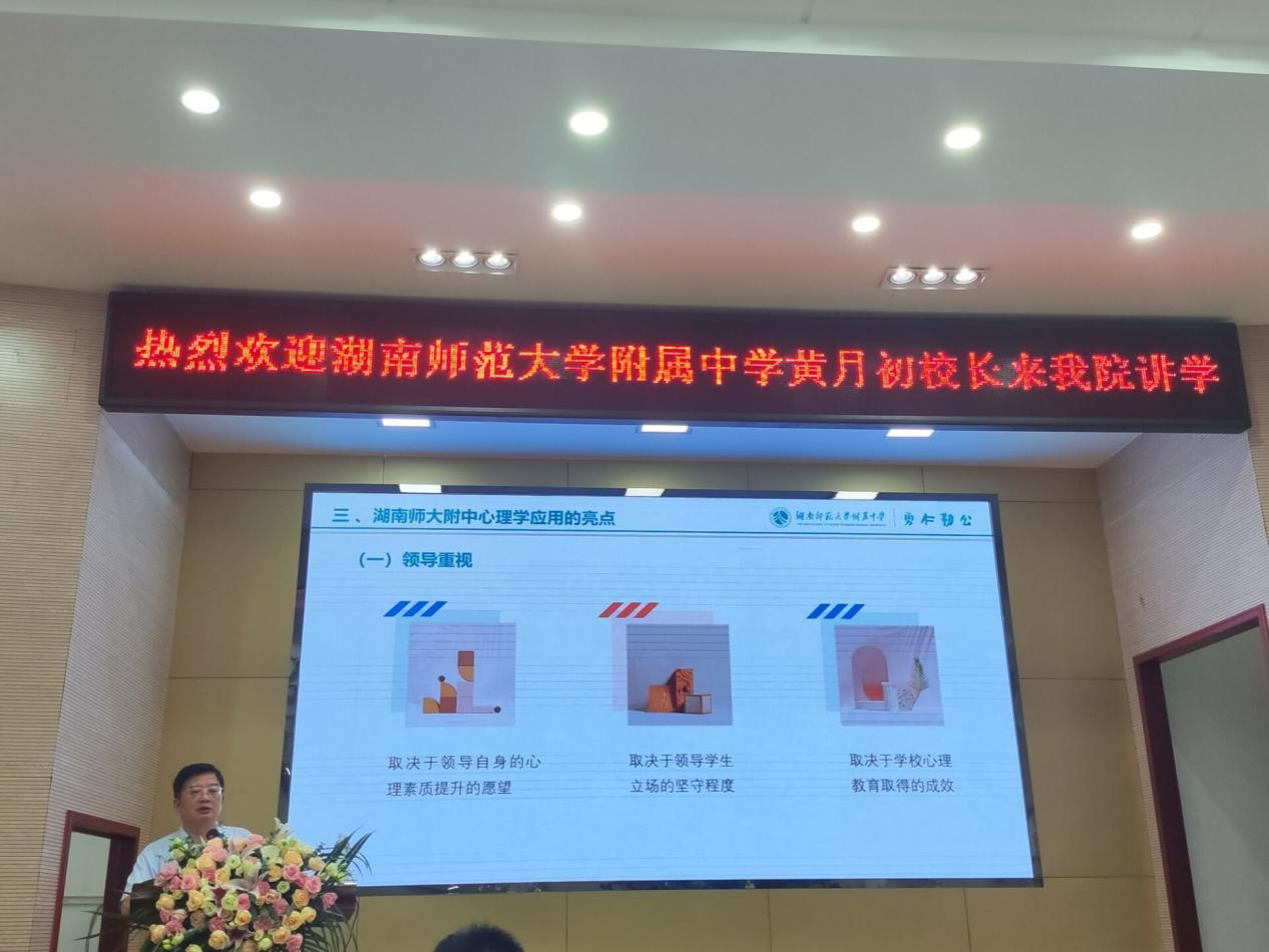 (通讯员 康露 罗京城)6月20日下午,湖南师范大学附属中学校长黄月初于教科院101报告厅做了题为“心理学在中学的应用”报告。讲座由教育科学学院副院长丁道群主持。