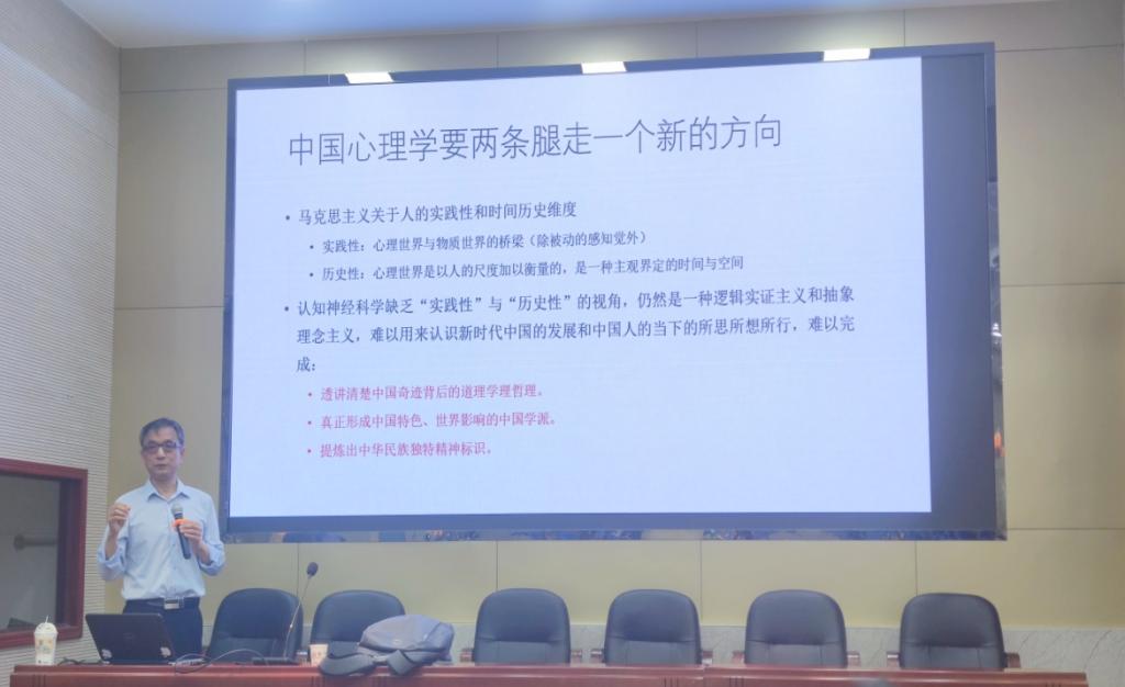 在本次讲座中,张建新老师首先提到了中国心理学面临的机遇与挑战,同时还谈到了习近平同志在哲学社会科学工作座谈会的重要讲话,强调科学与人文要实现“双腿走路”,否则中国心理学的发展会面临困境。然后,张老师对心理学领域各类知识的分化提出了独特的见解,认为心理学难以完全摆脱非科学、非理性科学的人文理论的羁绊和影响,并针对这一现实,举出科学与人文“双腿走路”的一系列举措。其中,最重要的对策就是我们要全面重视人的“实践性”与“历史性”。讲座最后,张老师提出中国心理学要两条腿走一个新的方向,它包括三个维度,分别是讲清楚中国奇迹背后的道理,哲理;真正形成中国特色、中国影响的中国学派;提炼中华民族独特精神标识。从张老师这场讲座中,大家感触良多,深受启发。一方面,我们中国的心理学家不仅要研究心理学,还要研究心理学文化。另一方面,我国的心理学家不仅要研究国内心理学,还要注重与国外心理学接轨,并且,还要多学习马克思主义,把马克思主义方法融入到当前的学习和生活中去。