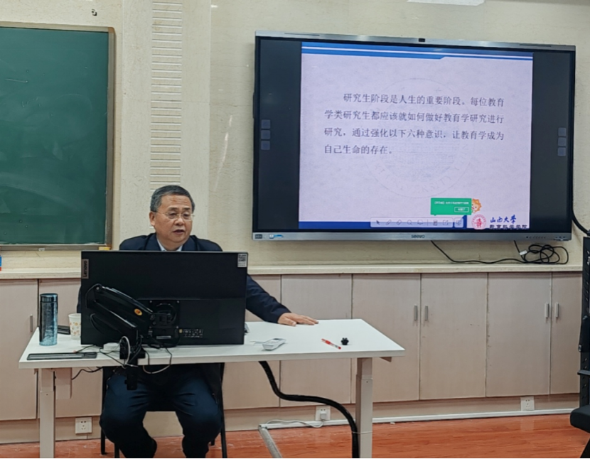 侯怀银教授首先提出研究生阶段是人生的重要阶段,每位教育学类研究生都应该就如何做好教育学研究进行研究。随后侯教授指出,应通过强化“入门意识、规划意识、前提意识、方法意识、目标意识、生活意识”六种意识,让教育学成为自己生命的存在。侯怀银教授结合实际案例,从多个角度对如何强化六种意识进行了详细而全面的阐述,令在场师生对如何进行教育学研究有了更为深刻的理解和认识。整个过程师生积极参与,学术氛围浓厚。