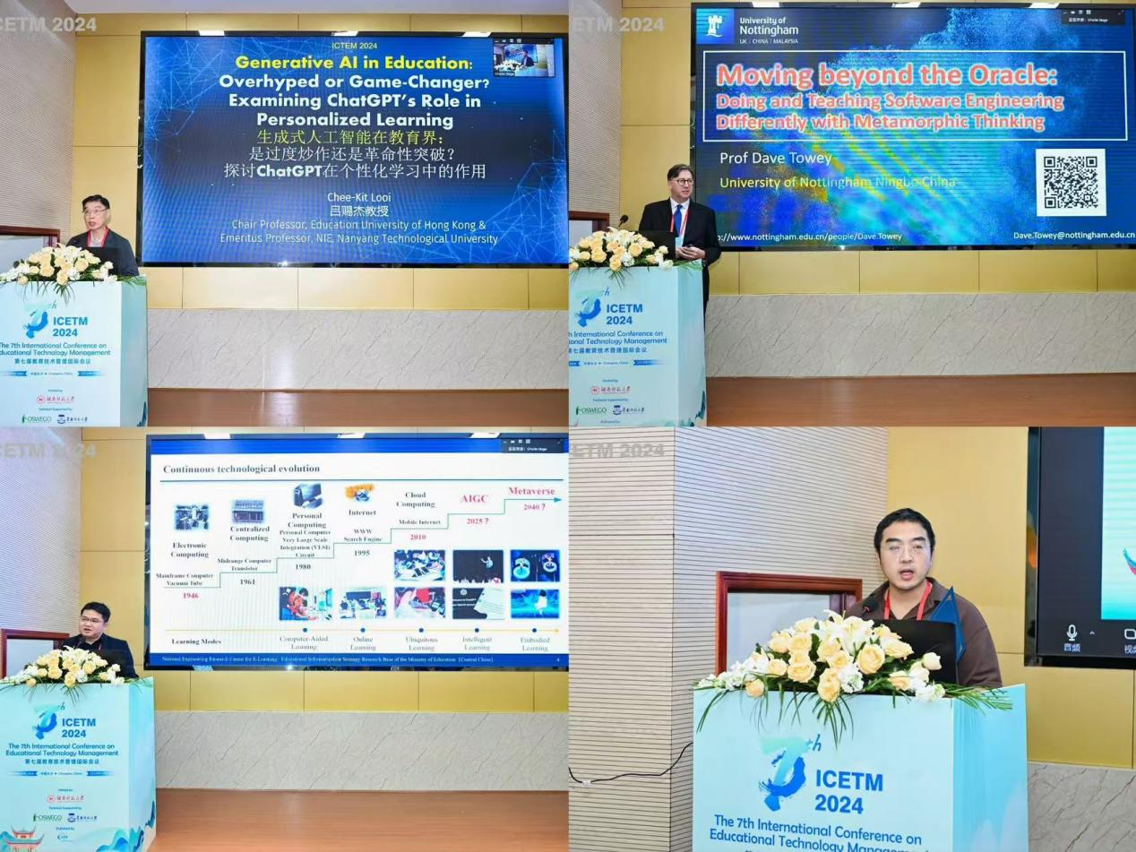 主旨报告环节,新加坡南洋理工大学Chee-Kit Looi教授,加拿大多伦多大学 James Slotta 教授,华中师范大学吴龙凯教授,宁波诺丁汉大学Dave Towey教授分别就“《教育中的生成式人工智能:过度炒作还是游戏改变者?——探讨ChatGPT在个性化学习中的角色》” “《引入多学科探究式学习:21 世纪课堂的新方法》”“《驾驭数字化浪潮:探索教育中的机遇与挑战》”“《超越传统:通过变形思维以不同方式进行和教授软件工程》”等主题作精彩演讲。