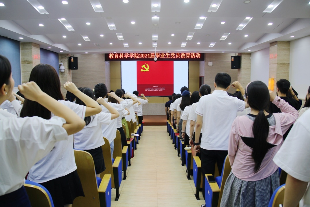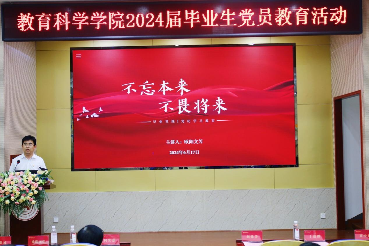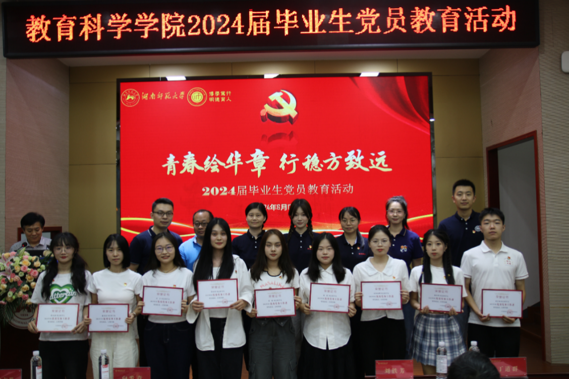 (通讯员 虞晓沁 田宇)6月17日下午,教育科学学院在学院101报告厅隆重举行了以“青春绘华章 行稳方致远”为主题的毕业生党员教育活动。学院党委书记向发意、院长刘铁芳、副院长丁道群、赵亮、容中逵、党委副书记欧阳文芳、专职组织员王赛波和学生党支部第一书记出席活动。活动由向发意主持,160余名毕业生党员和获奖学生党员参加。