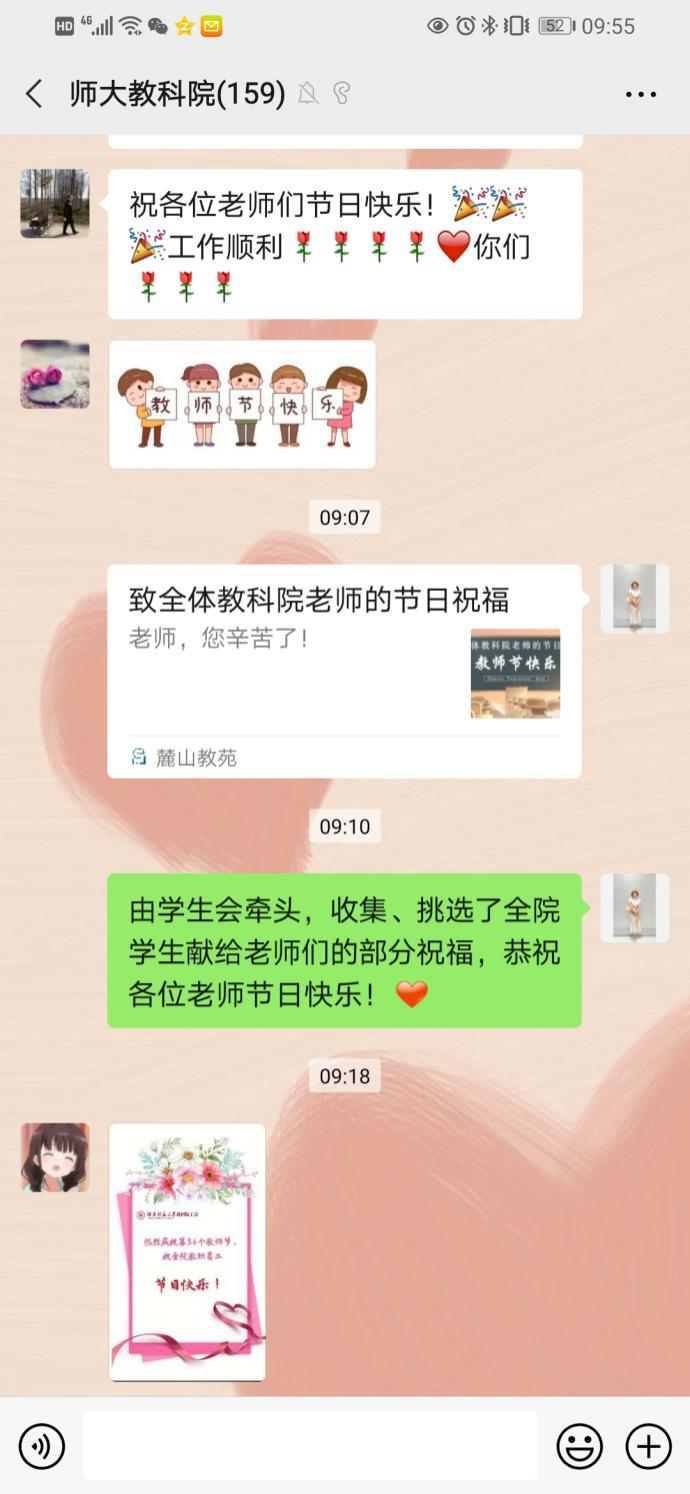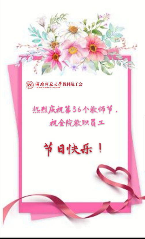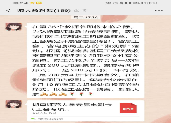 为弘扬尊师重道的传统美德,表达对全院教职工的诚挚敬意,在第36个教师节来临之际,教育科学学院部门工会组织开展了暖心的问候活动和省委宣传部、省总工会、省电影局主办的“湘观影”活动,为工会会员送上电影票券,以丰富教职工的精神文化生活,提升节日的仪式感和职工幸福感,并在节日当天制作专属的图文祝福,祝福大家节日快乐。