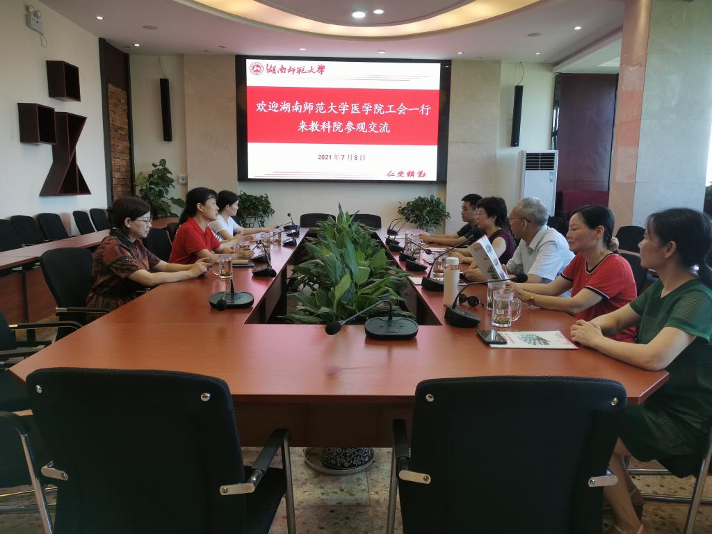 通讯员谭梦)(供图邓光祁)7月8日上午,医学院党委书记鄢朝晖带领学院工会全体干部到教科院参观交流,教科院党委书记汪植英、工会主席张卫民等在学院七楼教工之家热情接待了客人,并召开了座谈会。