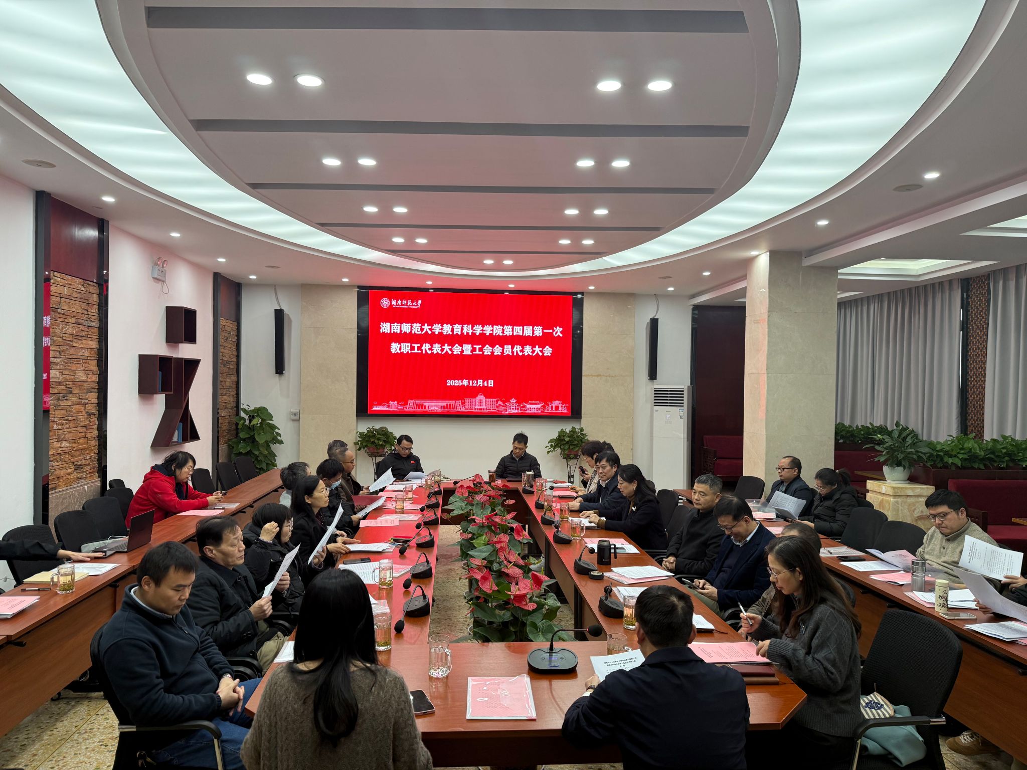 2025年12月4日下午15:00,教育科学学院第四届第一次教职工代表大会暨工会会员代表大会在学院七楼会议室隆重召开。大会由学院工会主席姜新生主持,全体教职工代表齐聚一堂,共商学院发展大计,共绘工会工作新蓝图。