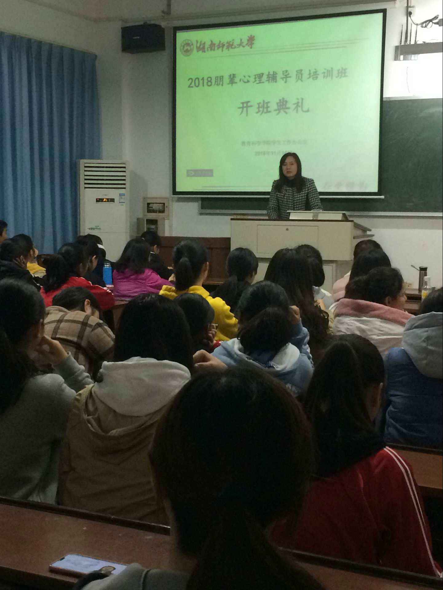 (通讯员 周意智 马欣)11月14日中午,教育科学学院在院104教室举办2018级朋辈心理辅导员培训班开班典礼暨第一次培训讲座。学院心理专干马欣老师、优秀朋辅代表2015级刘江惠同学、学生会心理部全体成员以及2018级73名朋辈心理辅导员到场参加。