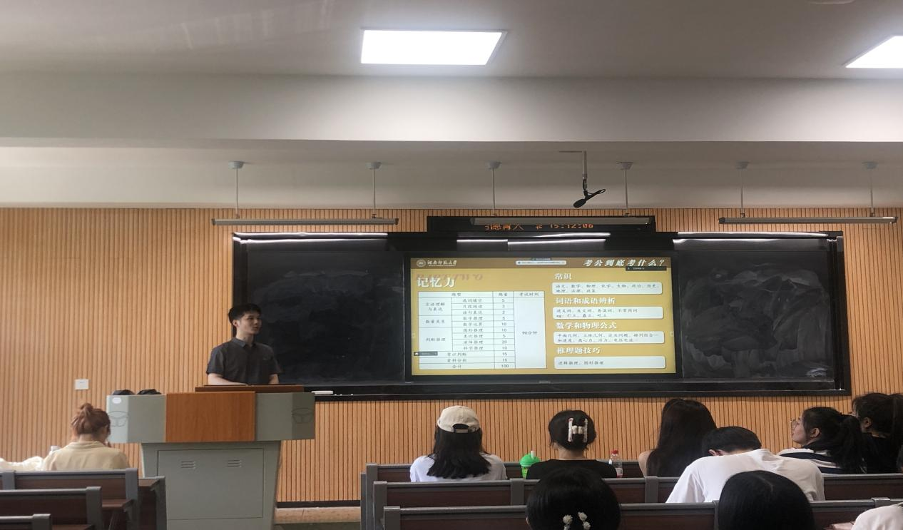会上,袁翔宇结合自身的经历,从考公原因、获取信息、如何备考、备考内容等方面分享了自己的经验。他表示,大家在决定是否考公之前一定要认清个人的职业定位,然后全身心投入到备考过程中,只有充分准备才能取得好成绩。