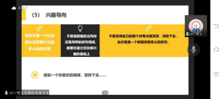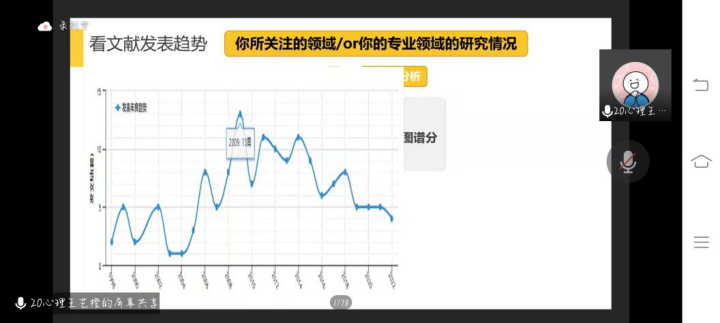 王艺橙以“如何确定研究主题和研究思路”为主题,围绕“确定研究主题和研究思路的关系”“如何确定研究主题”“如何确定研究思路”三个方面分别展开论述。并从现实导向、政策导向、文献导向、导师导向、兴趣导向这五个方面详细介绍了如何确定研究主题。王艺橙还结合自身经验,紧扣时事热点,以折线图的形式向大家直观的展示了如何看文献发展趋势以此来确定大致的研究方向。最后王艺橙鼓励大家大胆尝试科研,为大学生创新创业大赛做准备。同时也要正视科研,脚踏实地。