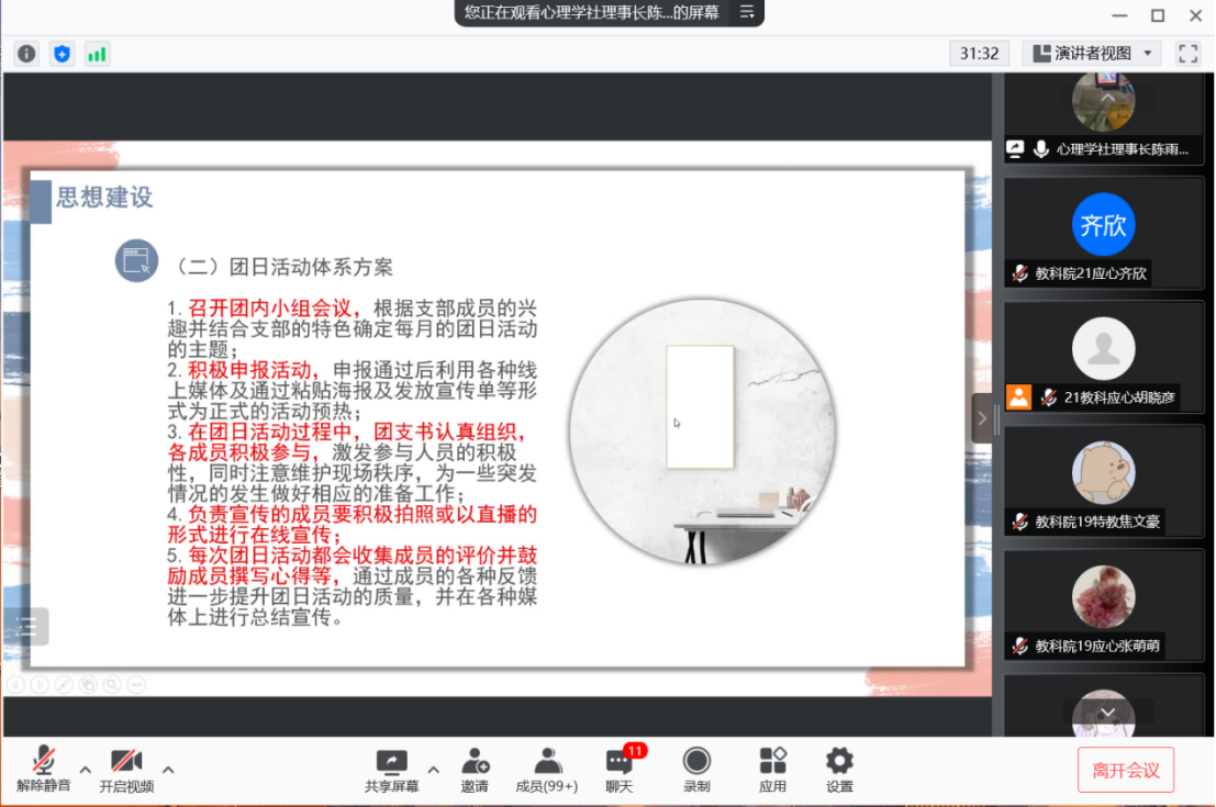 (通讯员 齐欣 何芳 向红举)11月13日晚,教育科学学院心理学社在腾讯会议上举办第一次支部团员会议暨见面会。此次会议由心理学社理事长陈雨欣、心理学社理事胡晓彦主持,心理学社部分会员参与会议。