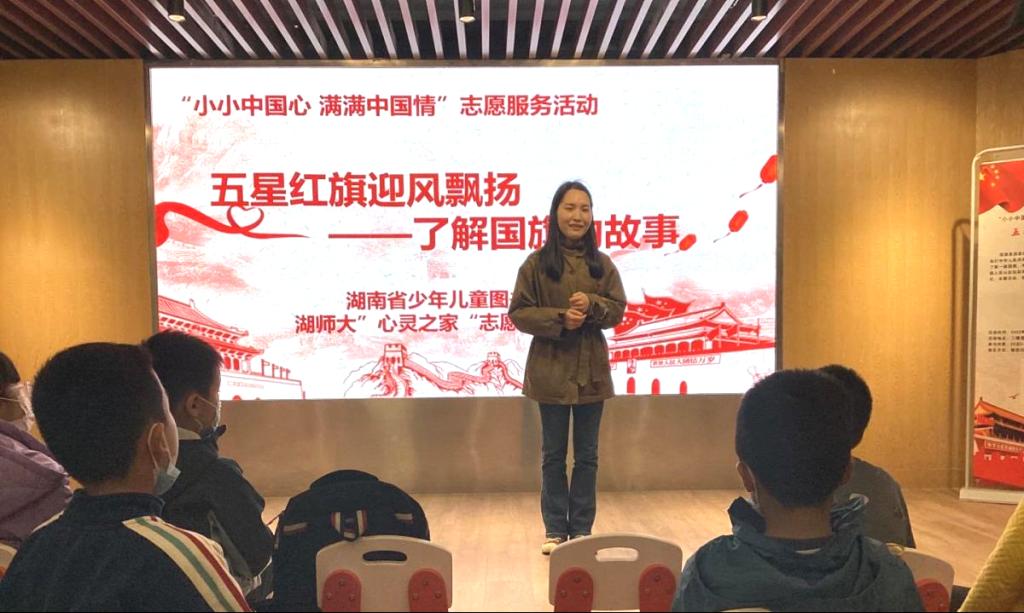 (通讯员 王艺橙 刘丹)5月15日下午,教科院团委青年志愿者工作部组织开展的“小小中国心,满满中国情”校级志愿活动于湖南省少年儿童图书馆举行。此次活动以“五星红旗,迎风飘扬”为主题,系“红色故事会”系列志愿活动的第五期第一次活动,少年儿童图书馆馆员张且老师与20位小朋友及其家长参与其中。