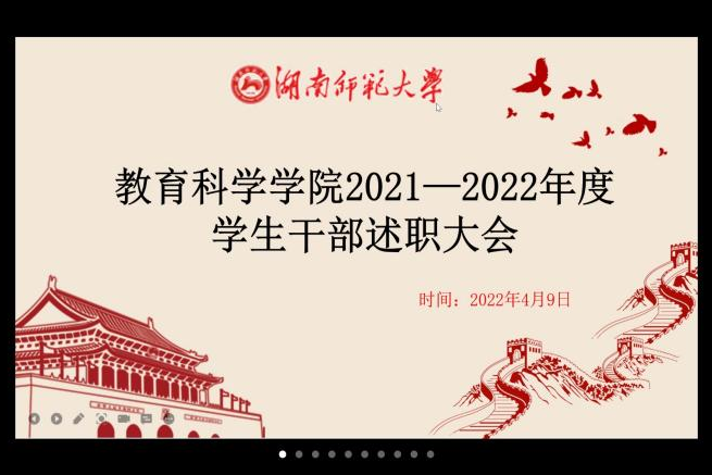 (通讯员 曾文巧 沈丽莉 艾希晨)4月9日晚,教育科学学院2021~2022学年度学生干部述职大会于腾讯会议线上平台召开,学院团委书记谭梦及各学生系统指导老师出席。