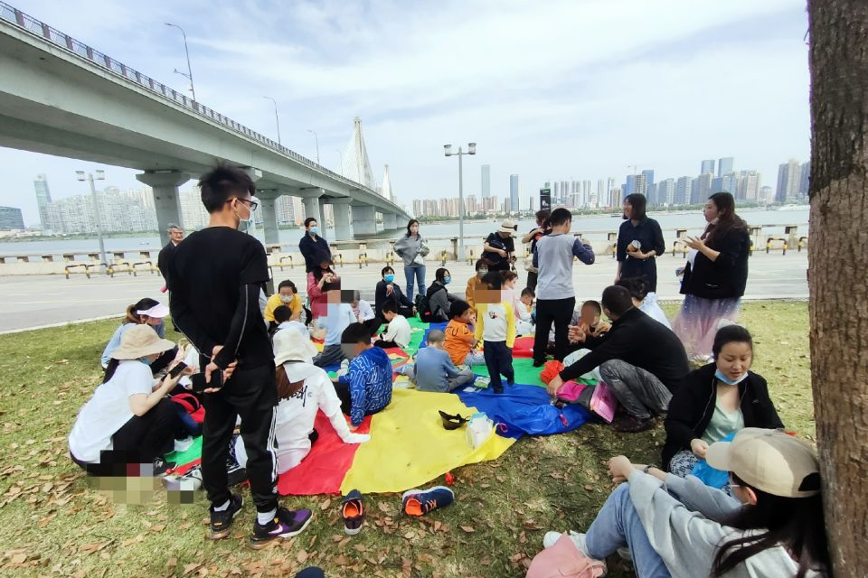 活动开始前,确认参与人员。老师针对每位不同孩子的性格特点做出分组,使得志愿者与小朋友配对和谐。随后列队出发。抵达湘江后,队伍在草地上休息。老师取出野餐垫,和孩子们一起吃下午餐。小朋友在老师和志愿者的陪同下,欣赏湘江的风光,玩耍沟通,增进友情。