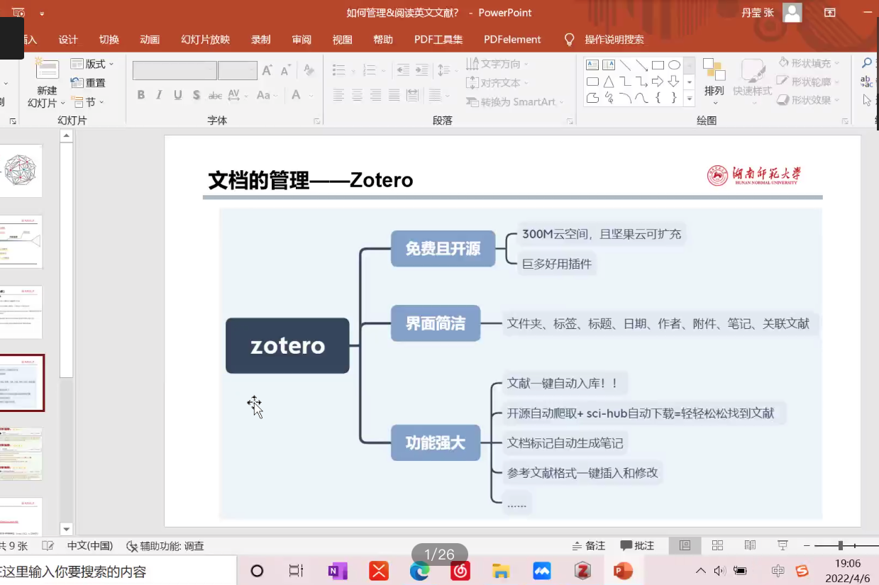 张丹莹以“如何管理和阅读英文文献”为主题,围绕“文献下载与排列”“阅读技巧”“内容整理”三个方面分别展开讨论,结构分明,清晰易懂。她表示本期精勤讲堂的主题是基于自身保研后才真正踏入科研行列的现状而选取的,并且抛出阅读英文文献时的许多困惑,引起大家的共鸣。讲述过程中,张丹莹结合自身阅读英文文献的实践经验与心得体会,向大家分享文档下载和管理的优质软件以及文献内容整理的方法。她指出,内容整理应先做加法,再做减法。加法即广泛收集信息,减法即筛选个人需要的内容,摒除多余无关的信息。此外,她还分享了三步阅读法等阅读技巧。第一遍读标题、摘要和插图;第二遍读引言和结论,并快速浏览论文的其他部分;第三遍阅读论文的全部内容,跳过不熟悉的复杂公式和专业术语。在讲堂的自由提问环节,张丹莹耐心解答同学们提出的疑问,积极鼓励同学们沉下心来阅读英文文献。
