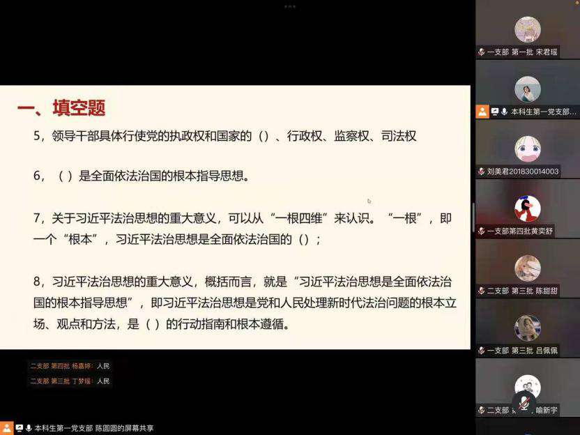 (通讯员 谭蓉 宋君瑶)1月29日,教育科学学院本科生第一、第二党支部于腾讯会议开展以“学习习近平法治思想”为主题的线上党日活动。活动由本科生第一党支部书记陈圆圆主持,共包含知识学习和知识竞答两个环节。