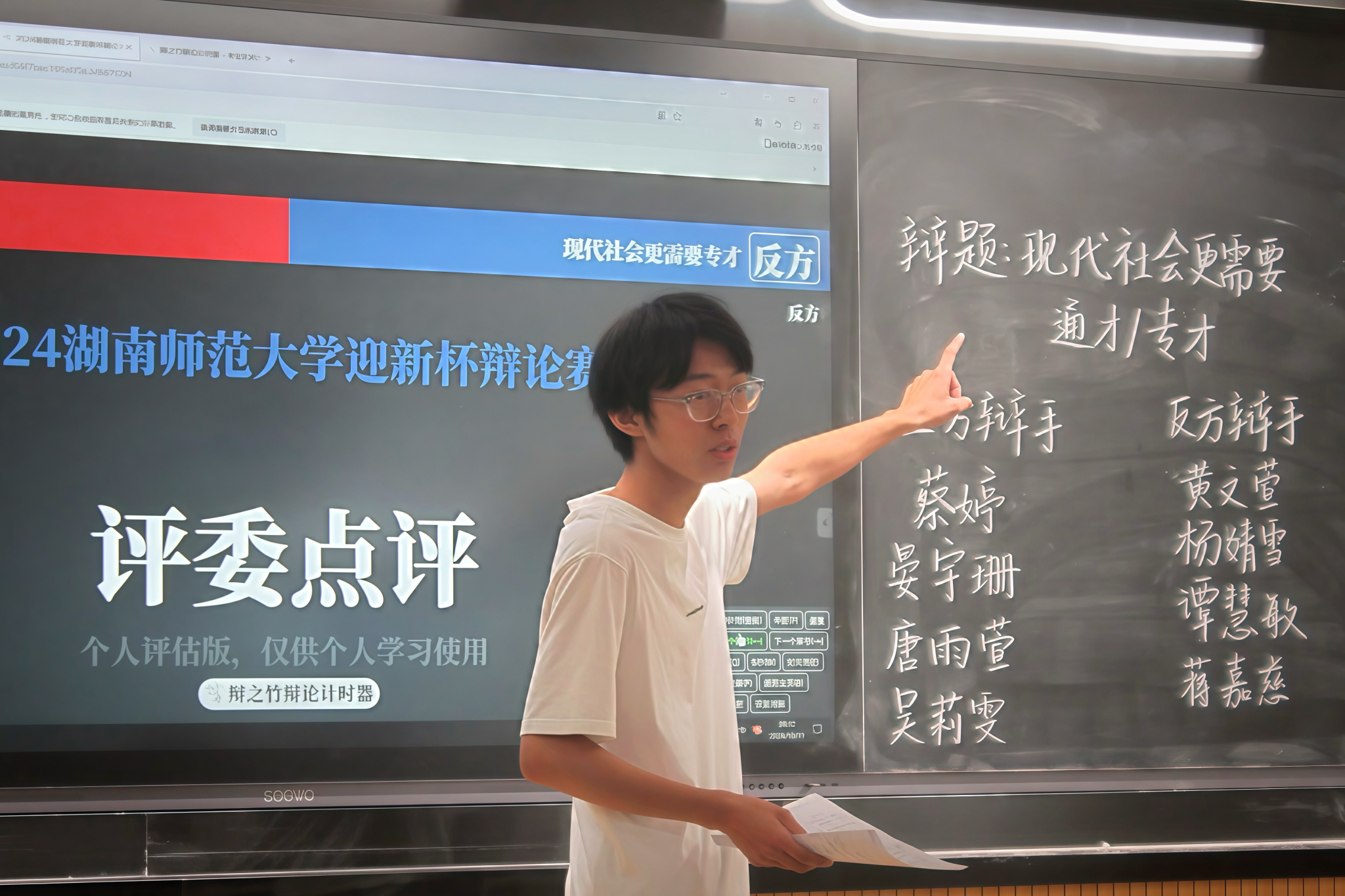 (通讯员 旷晓茜 黎思娆)10月19日晚,教育科学学院(以下简称“教科院”)辩论队于田家炳教育书院201举办2024年院“迎新杯”辩论赛初赛。此次比赛辩题为“现代社会更需要通才/专才”,由教科院2023级辩论队队员付雅芬担任主席。教科院2023级辩论队队长旷晓茜、队员蒋希沅,化学与化工学院2023级辩论队队员王文弟担任此次比赛的评委。正、反方辩手分别来自2024级小学教育班和心理班。