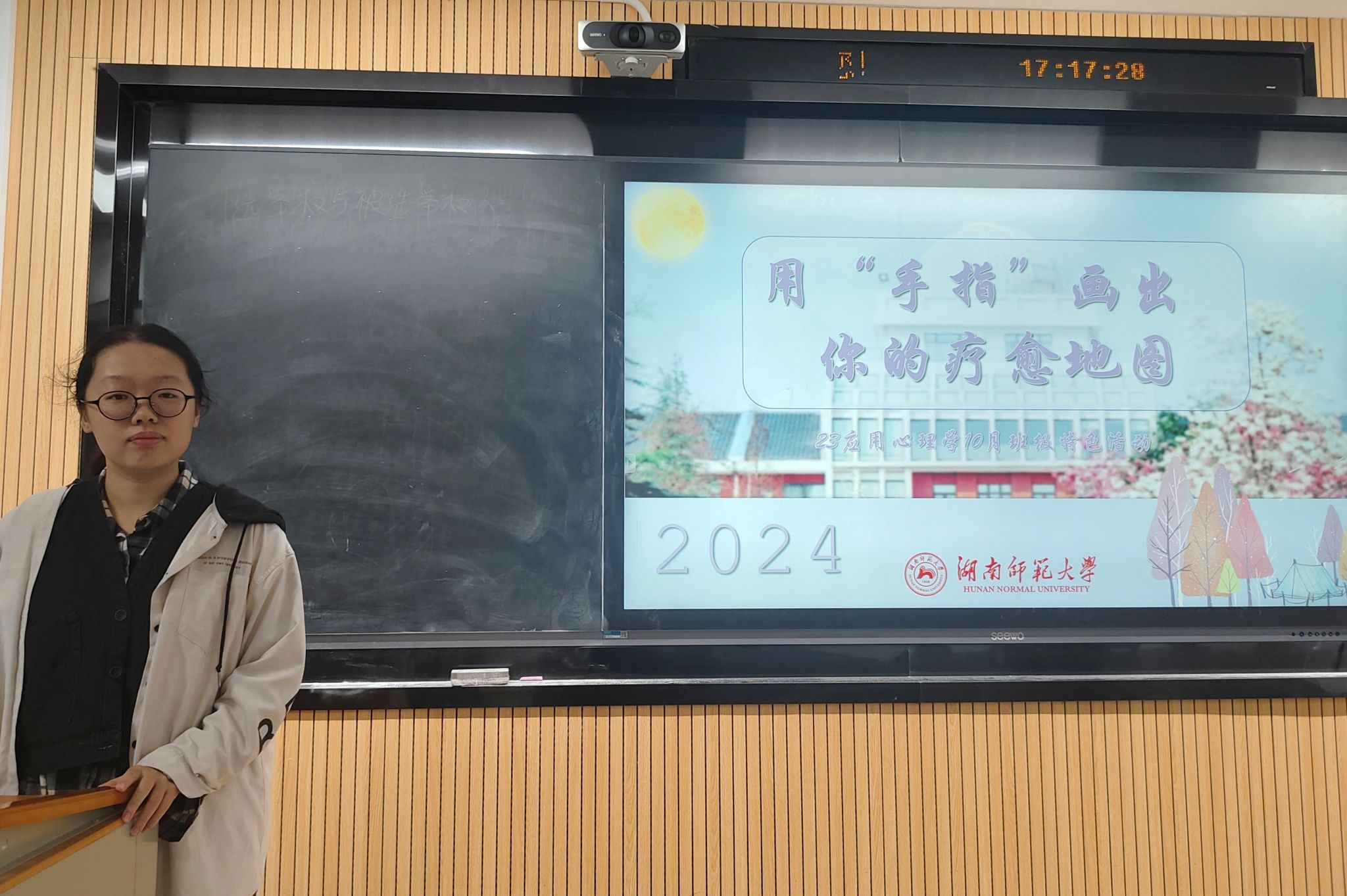 (通讯员 杨香桂 黄金枝)10月24日下午,为引导同学们正确认识并积极面对学习和生活中的压力,提升自我效能感,教育科学学院2023级应用心理班在教科院302教室举办“用‘手指’画出你的疗愈地图”主题心理特色活动。此次活动由23级应用心理班班长刘堇萱主持。