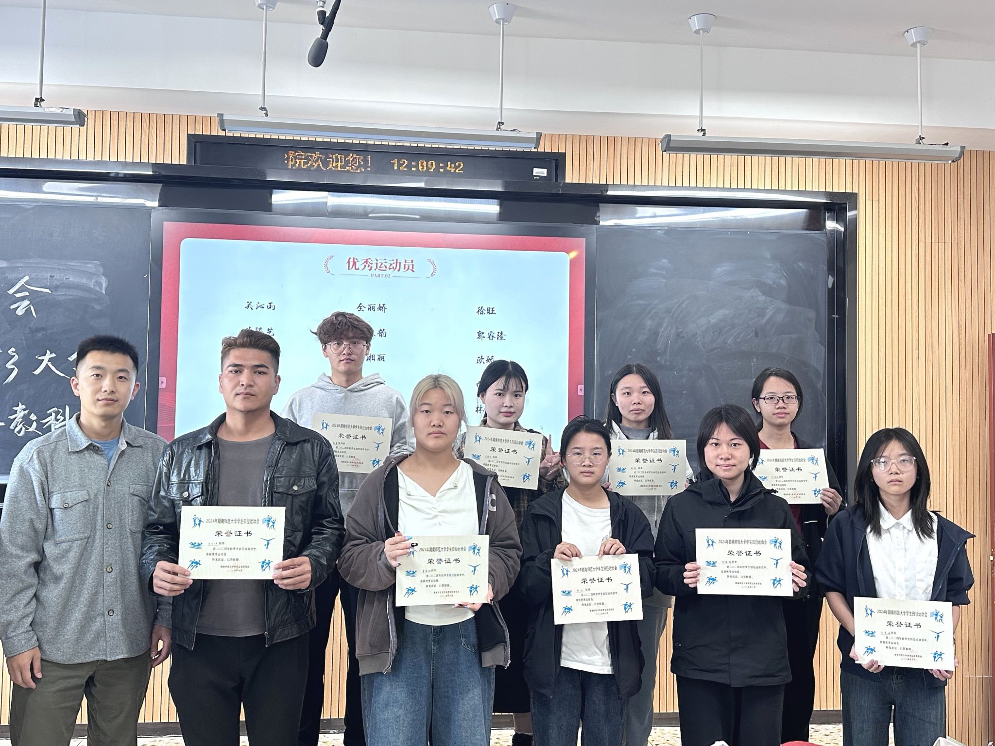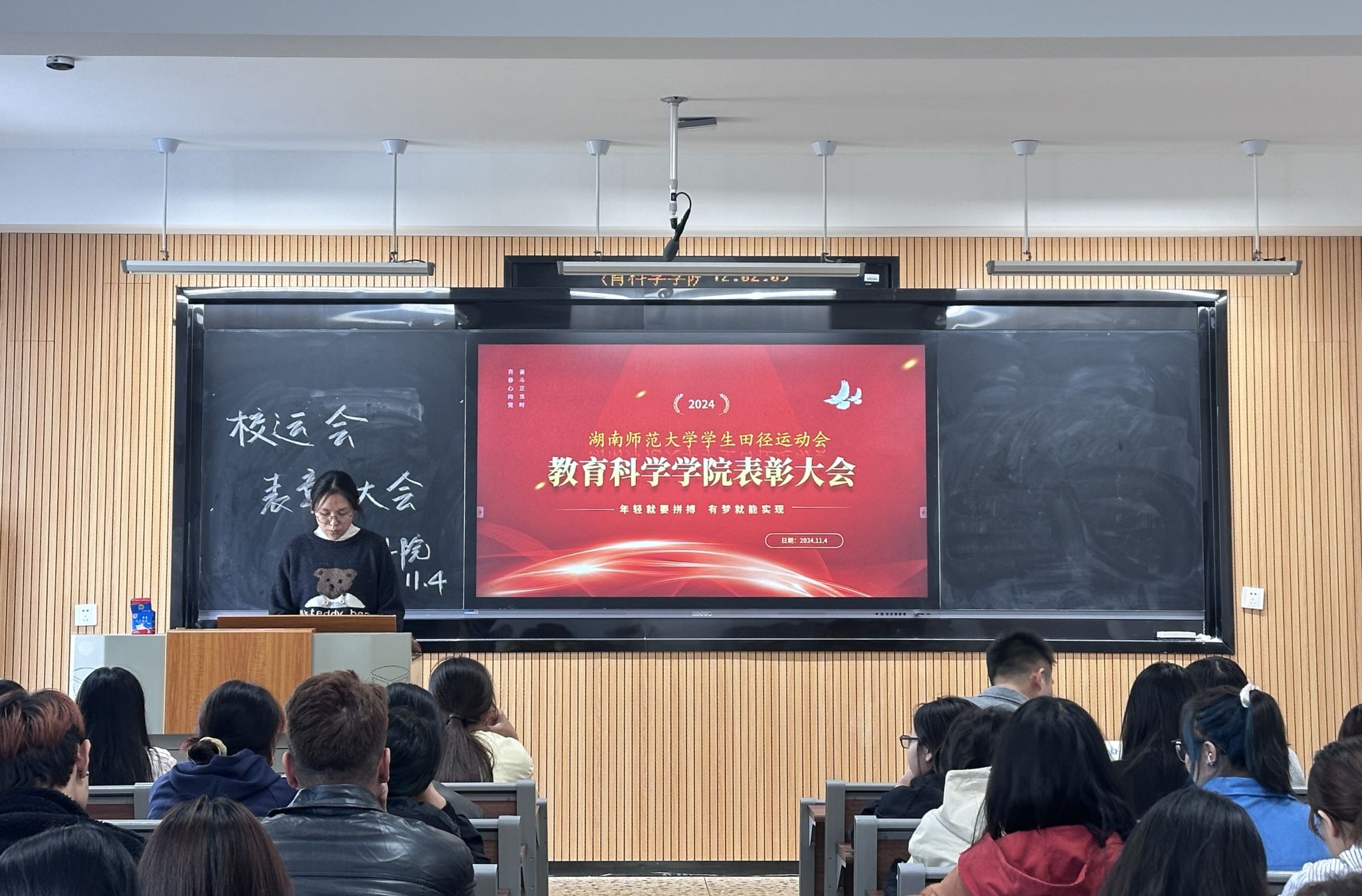 (通讯员 向锦霖 黎思娆)为弘扬体育精神,表彰在校运会中表现突出的运动员,11月4日中午,教育科学学院(简称“教科院”)在209教室举办2024年校运会表彰大会。学工办庞瑞宇、参赛运动员及45名观众参加了此次会议。学业体育部负责人向锦霖担任会议主持人。