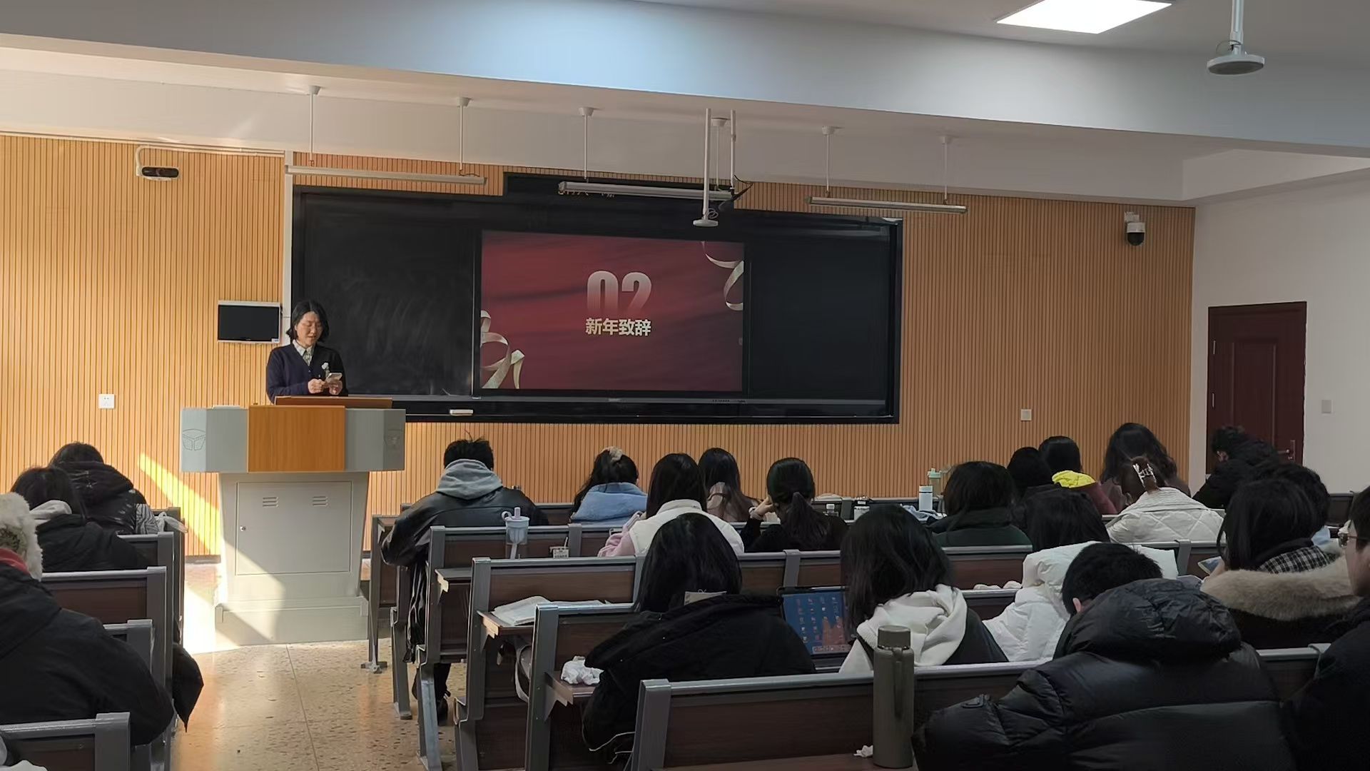 杨文辉作总结发言和新年致辞。她对同学们过去一年的勤奋与智慧给予了高度评价,对班级取得的成就表示热烈祝贺。同时激励全体同学在新的一年里继续同行,保持团结协作与奋发拼搏的精神,争取再攀高峰。