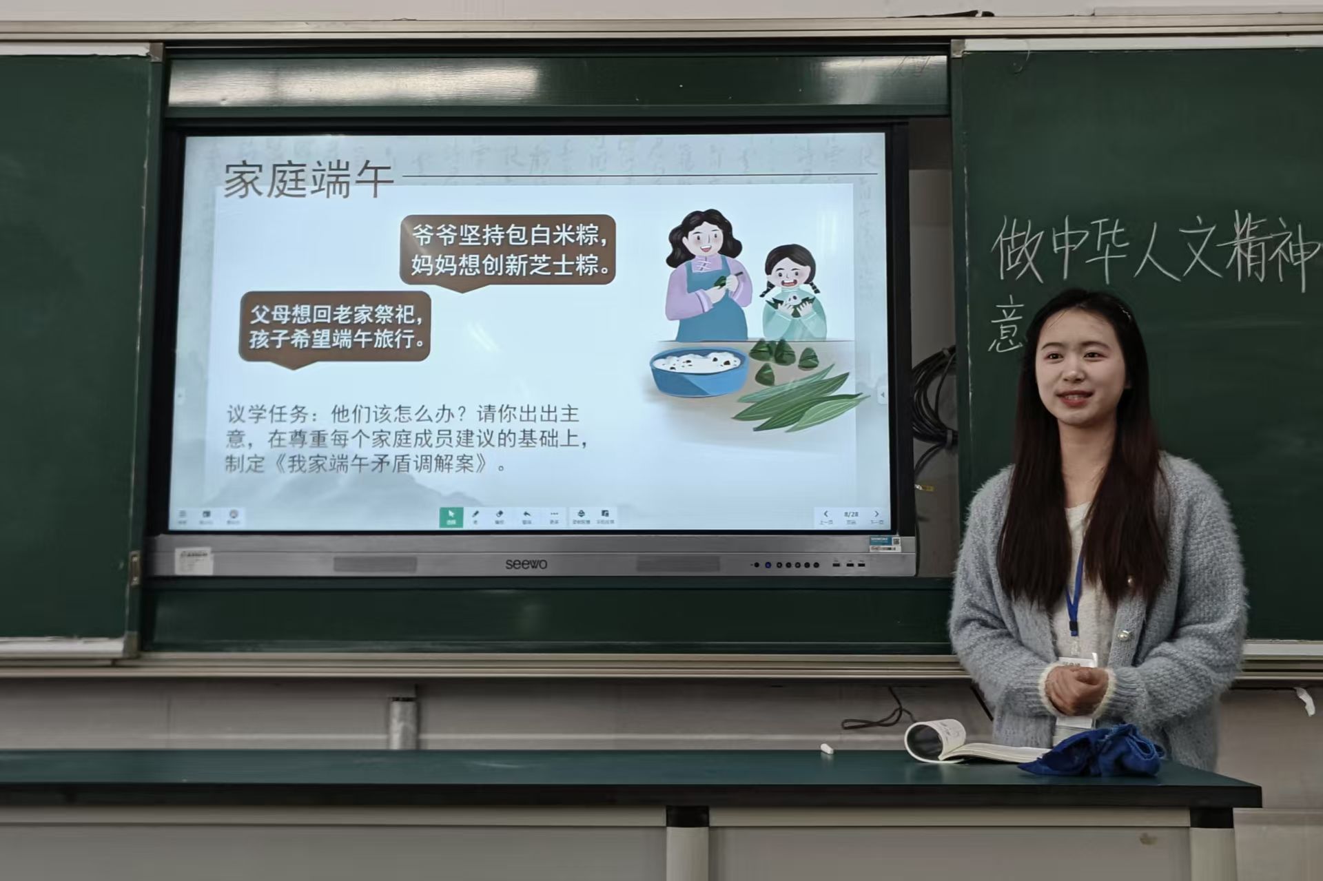 活动分为试课展示与点评指导两个环节。试课前期,三位主讲人设计课程教案,并配套制作课件与逐字稿。曹诗杰以“人要自强”为主题,通过视频导入、小组讨论等方式引导学生理解自强精神的内涵;管丽萍围绕“做中华人文精神的弘扬者”,结合案例分析,探讨中华传统文化的当代价值。徐章林则以八年级“国家权力机关”课程为切入点,通过逻辑推演与动画演示,深入解析知识点。