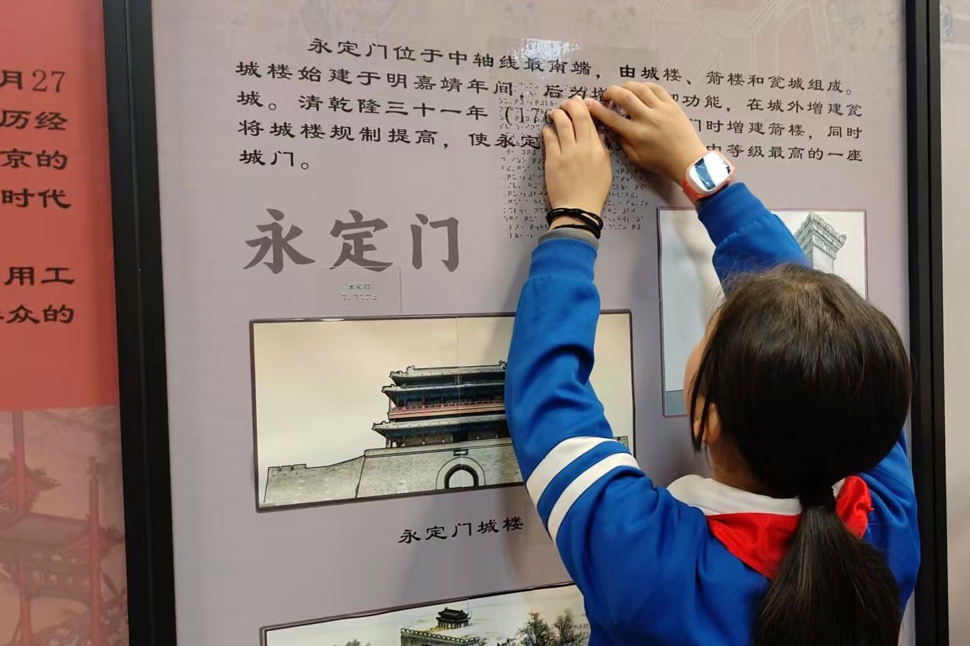 活动中,启明部64、65班学生在教师带领下,通过地铁出行实践抵达非遗展厅。现场设置盲文展板与3D打印建筑模型,学生通过触摸钟鼓楼、万宁桥等建筑模型及中轴线沙盘,配合音频讲解了解天坛声学构造、故宫建筑规制等知识。“指尖的凹凸让我读懂了‘殿宇巍峨’。”学生李嘉欣触摸太和殿模型后表示。活动同步融入地铁购票、安全通行等生活技能实践,强化学生社会适应能力。