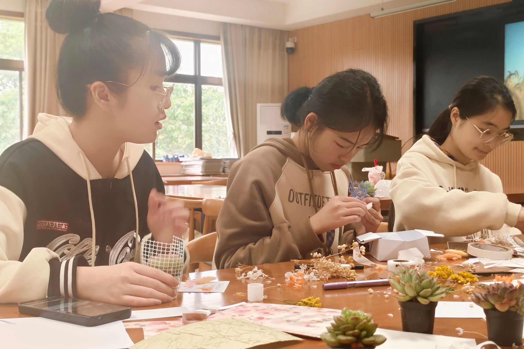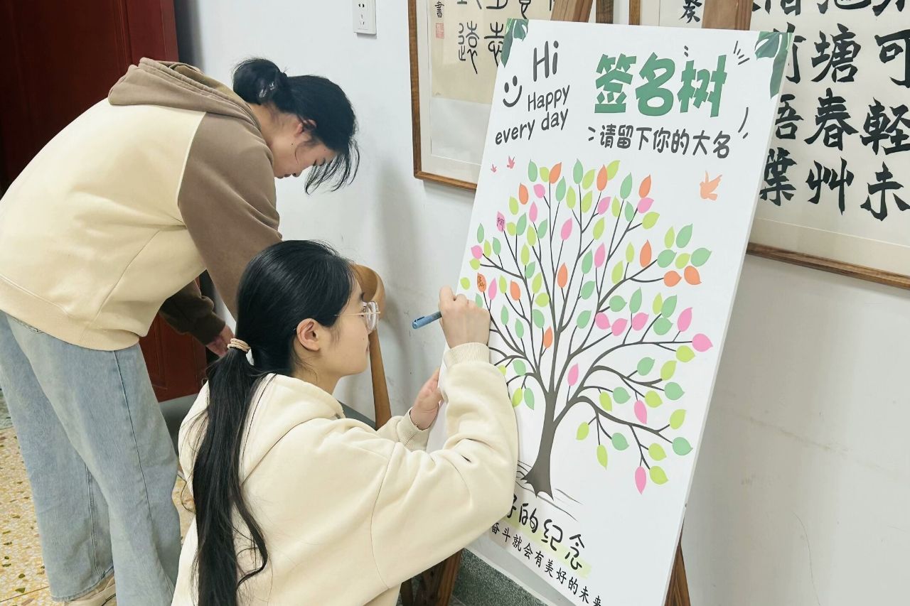 活动当天,会员们到达教室后先进行特色签到环节,每位会员用彩笔在签到板上画出绘制喜欢的植物图案。随后,主持人谢昊楠详细介绍活动流程,并组织会员挑选绿植进行装饰。心理学社精心准备了永生花、毛绒球、彩笔等材料,社团干事全程指导装饰细节,协助会员完成特色作品。其中,大部分会员选取永生花与毛绒球作为主要装饰材料,装饰完成后,会员们用彩笔在包装卡纸上写下自己的姓名并拍照打卡,记录自己独一无二的绿植,现场气氛轻松活跃。接着,谢昊楠邀请会员分享装饰思路和活动感受,给予积极分享的会员流苏钥匙扣作为小礼品。活动结尾,全体人员合影留念,心理学社干事对活动进行复盘,整理会员参与名单并收集活动打卡照片。