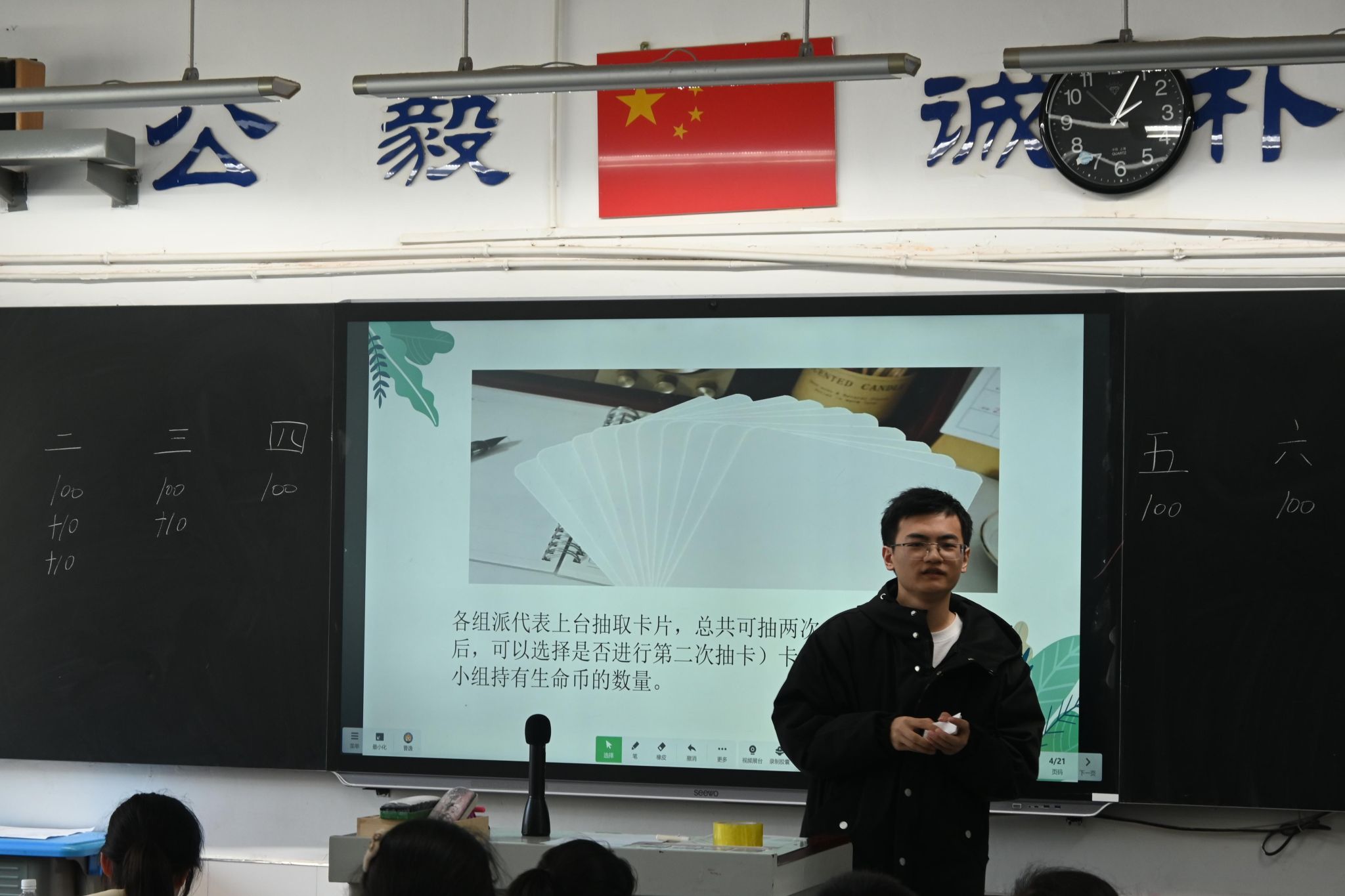 实习队成员曹逸以《走进生命》为主题,为初二年级学生呈现了一堂生动有趣、富有深意的心理健康课。课程突破了传统的说教模式,让学生在活动中获得快乐的同时,理解生命的特点,明白应该让自己的生命更精彩,实现了寓教于乐。课后评课环节中,刘颖对课程给予了高度评价,认为课程结构完整,活动关联性强,同时提出了注意时间把控的建议。张瑞婷对课程设计表示了肯定,认为学生上课比较活跃,参与度高,课程较为完美地实现了寓教于乐,学生在活动中对生命有了初步的理解,同时也提出了在分享活动中对班级纪律的管控问题以及课程点题不够的问题。余思指出了对初中生进行生命教育的重要性与必要性,对课程主题的选择进行了肯定。曹逸表示将充分吸收指导意见,不断完善课程。