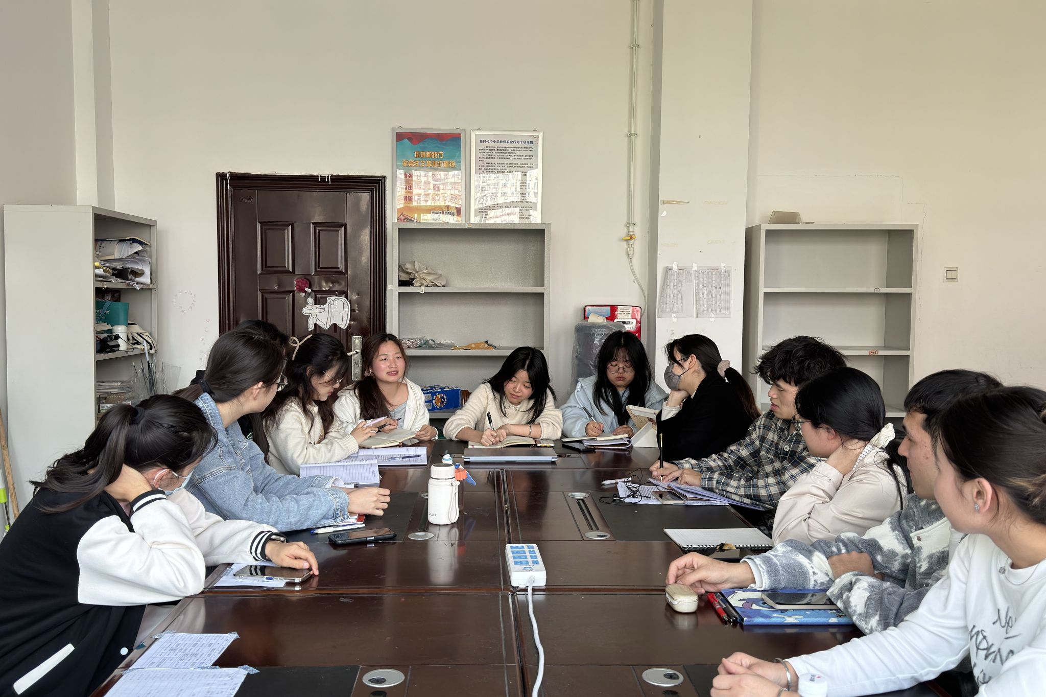 组长汇报环节,备课组表示,截至本周全体实习队员听课总次数已达20节基准,教学实践即将进入进班授课阶段;宣传组同步更新公众号推文并完成新闻稿写作,优化了媒体素材管理流程;考勤组公布全员全勤记录,号召队员及时上传粉笔字打卡截图;卫保组通过动态卫生值日表保障办公环境整洁;后勤组则落实会议纪要及财务台账归档工作。