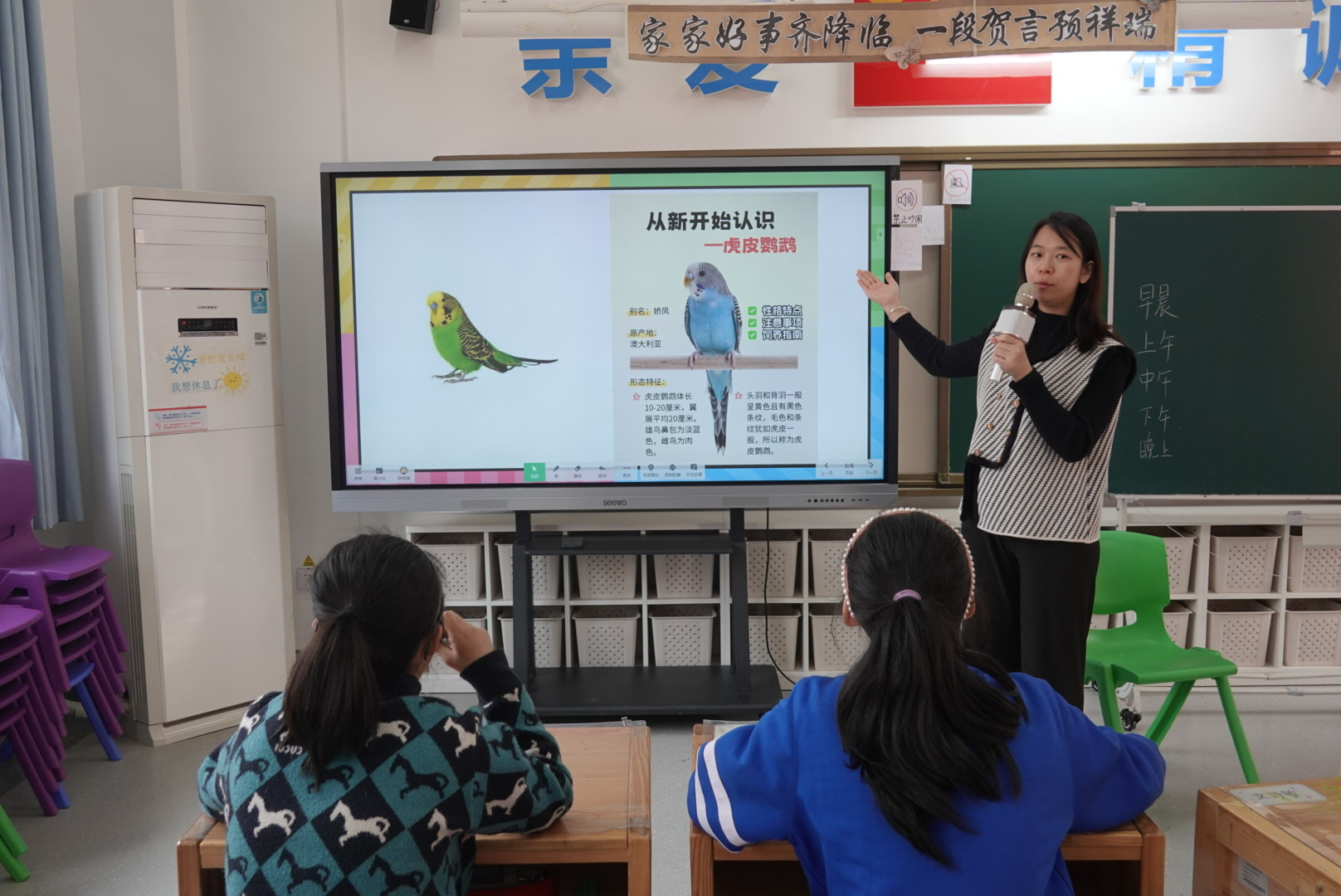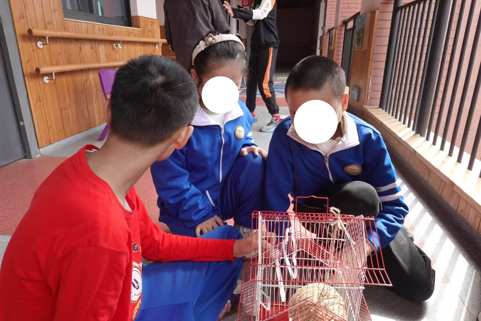 此次活动分为介绍动物伙伴、讲解喂养注意事项、友好互动三个环节。活动伊始,各班班主任带领学生将动物伙伴引入教室,并向学生详细介绍动物伙伴的品种特征和生活习性。随后,班主任从饲养环境、日常饮食、卫生清洁等方面向学生讲解喂养时的注意事项,引导学生形成科学喂养的意识。最后的友好互动环节中,班主任组织学生分组轮流接触小动物,并对抚摸姿势、互动距离等安全问题进行强调。实习队员全程协助维护现场秩序,确保互动安全。