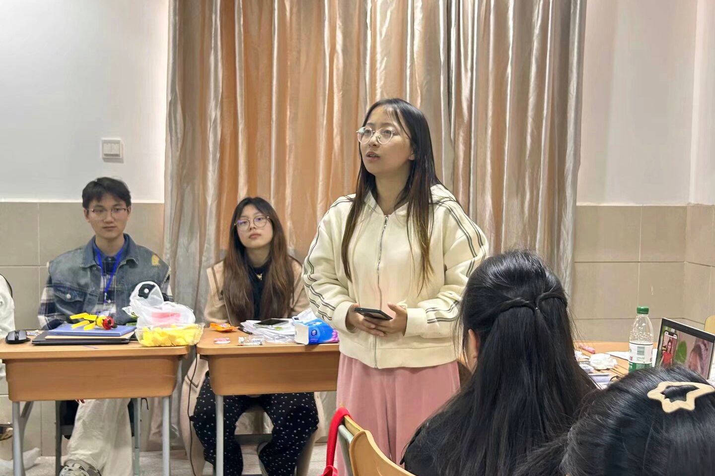 史滋福对全队工作进行了系统总结。她充分肯定了队员们的努力,表扬部分队员在课堂管理的有效把控,同时针对不同课堂采取的教学方法提出改进建议。此外,史滋福强调要进一步加强对师范生技能的练习,包括粉笔字、普通话等,并强调队员们要用开放的视角看待评价,调整好心态,继续保持积极与高昂的状态做好未来的实习教学与工作。