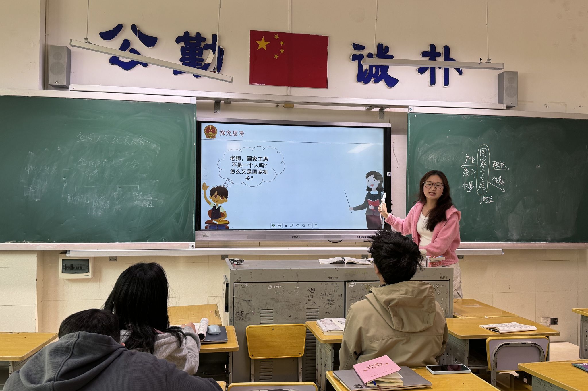 实习队员通过2025年两会视频、历任主席履职影像等多媒体资源导入新课,系统讲解了中华人民共和国主席的宪法定位、产生方式、候选条件及四项职权。授课特别设置设备故障、学生提问偏离等突发情境,全面检验教学应变能力。在知识讲解环节,队员创新采用“候选条件对比分析”、“职权流程图解”等教学内容,将抽象的宪法条文转化为可视化学习内容。