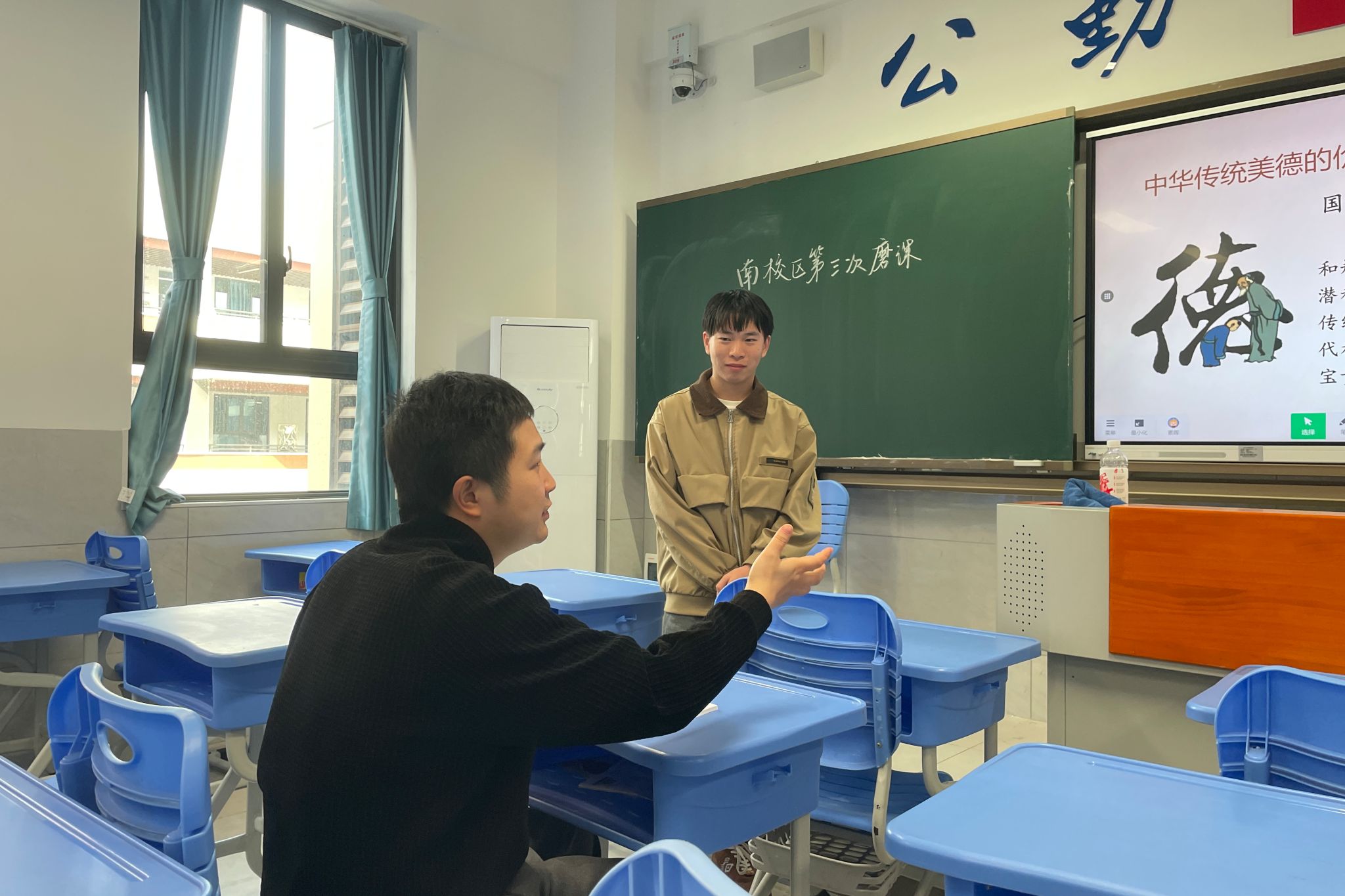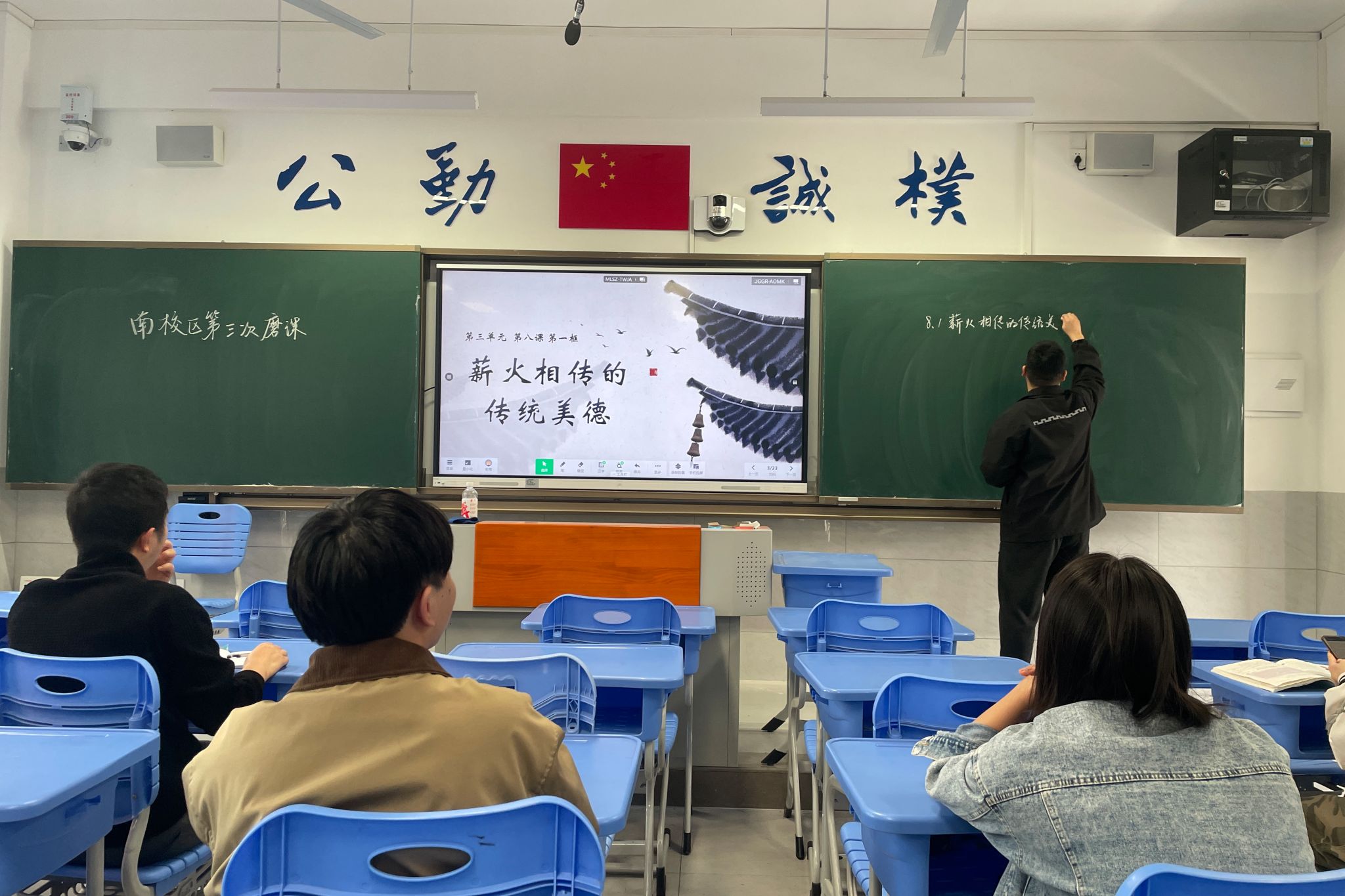 活动分为试课展示与点评指导两个环节。试课过程中,梅王晨围绕“薪火相传的传统美德”,融入案例分析,解读中华传统美德的内涵;胡赵凡以“做中华传统美德的践行者”为主题,穿插视频素材与小组讨论展开教学;刘章明深入挖掘历史人物岳飞,采用“一例到底”法系统讲解中华传统美德的传承。
