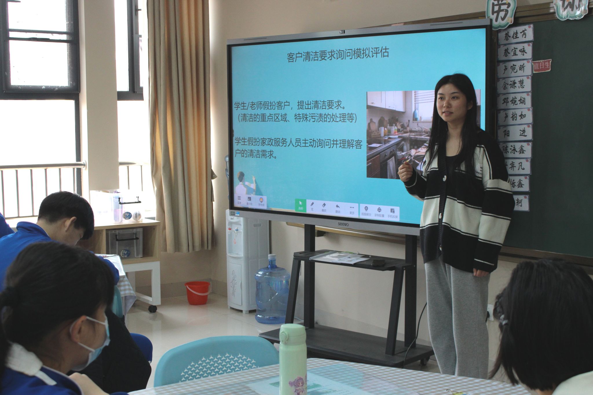 此次课堂分为启动、建构、巩固与总结四个环节。罗曌玺先通过提问引出了“家政服务员”的职业主题。建构环节中,罗曌玺播放视频,引导学生建立职业认知。她还结合了图片讲解了家政服务员的工作内容,并重点演示抹布、玻璃擦、凹槽缝隙刷等清洁工具的使用方法。赵云艺则负责指导学生分组进行实操练习。巩固环节中,同学们参与了知识抢答、叠毛巾大比拼等趣味游戏,强化在课堂上学到的内容。游戏过后,罗曌玺再次对课堂重点知识进行回顾与总结。