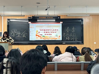 在思想培训会上,朱雅姿借用习近平总书记的故事,讲解了自身阅读《论党的青年工作》一书后的心得,表达了新时代青年要多读书,读好书,好读书的观点。她指出,学生会是学院的服务型组织,应发挥带头作用,营造良好的读书氛围,引导会内成员养成良好阅读习惯并提升自身修养,以此更好地为学院服务、为同学们提供帮助,为中国式现代化挺膺担当。