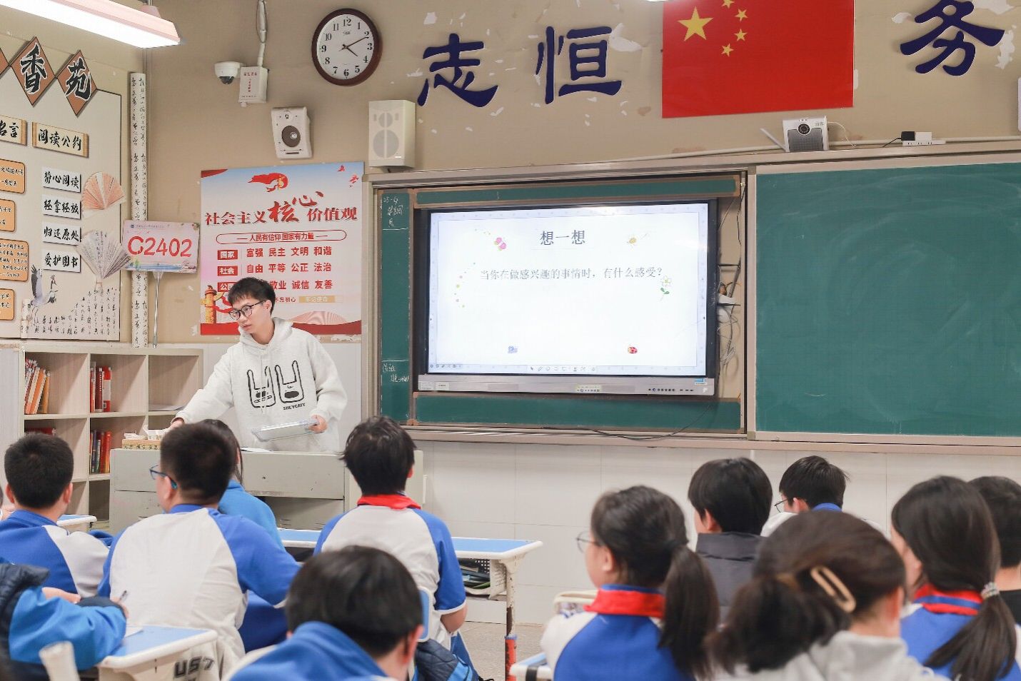 实习队成员欧阳凯以“心流的秘密”为课题,为初一年级学生带来了一堂富有启发性的心理健康课。课程围绕“心流”这一心理学概念,通过生动的案例分析和实践活动,引导学生体验专注与投入的状态,并探讨如何在学习和生活中运用心流理论提升效率与幸福感。欧阳凯巧妙结合多媒体资源和小组讨论,课堂氛围活跃,学生积极参与互动。