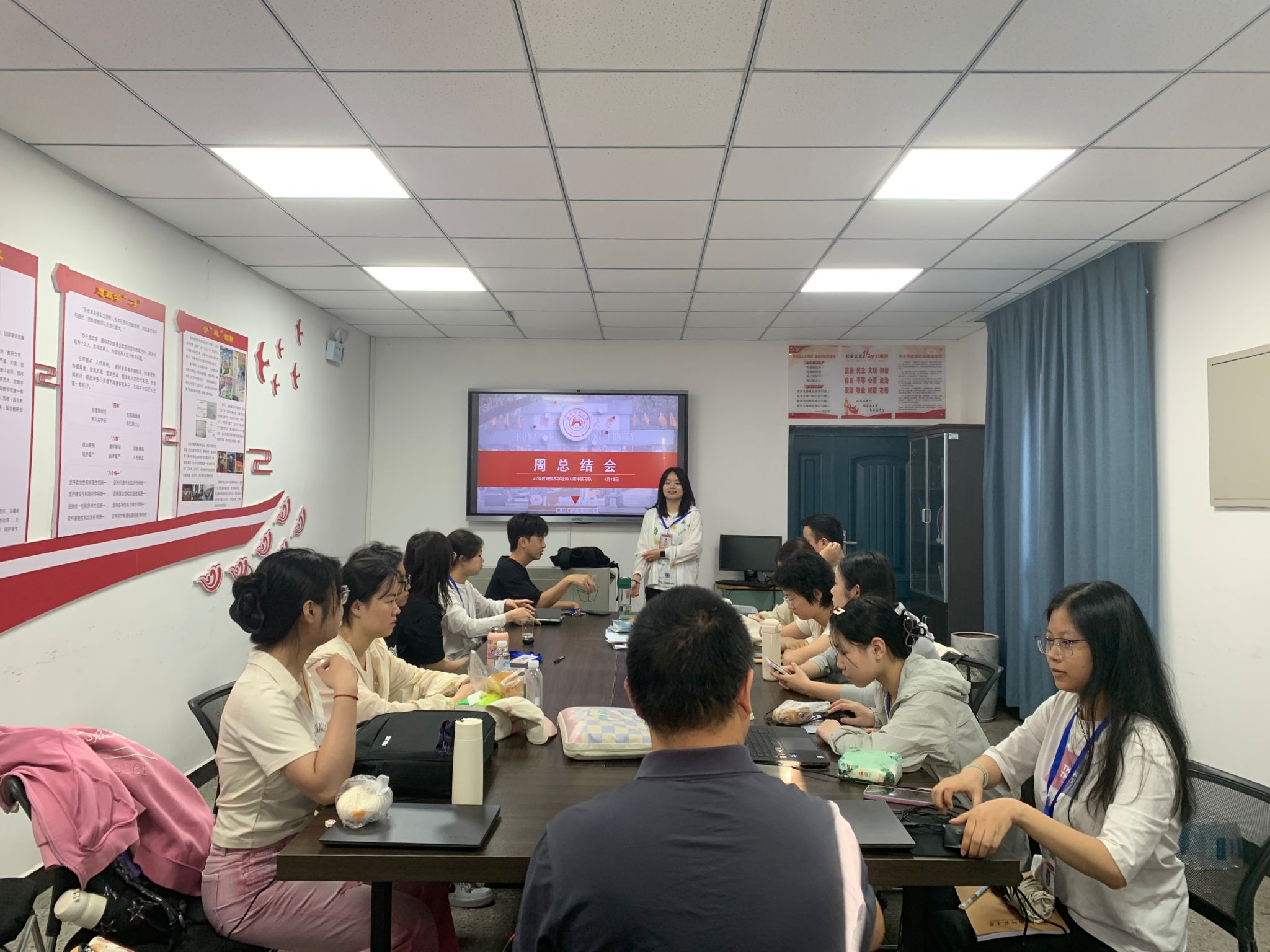 (通讯员 张金敏 张佳琪)4 月 18 日上午,教育科学学院 22 级教育技术学赴师大附中实习队在高阳楼教研室召开第七周实习总结会,会议由实习队队长张佳琪主持,指导教师刘迪及实习队全体成员参与此次会议。