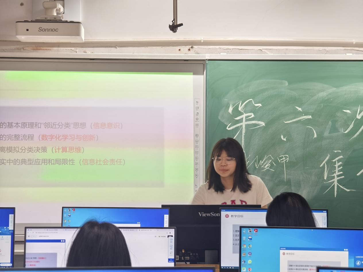 在说课展示环节,实习队三个小组分别呈现了各具特色的教学设计方案。第一组以“机器学习基础”为主题,系统构建了从概念认知到方法应用的教学框架;第二组围绕“KNN算法原理与实践”,通过数学建模与案例解析相结合的方式展开教学设计;第三组则聚焦“机器学习分类体系”,深入探讨了监督学习与无监督学习的核心特征与应用场景。三组展示均体现了对高中信息技术课程标准的精准把握,展现了良好的教学转化能力。