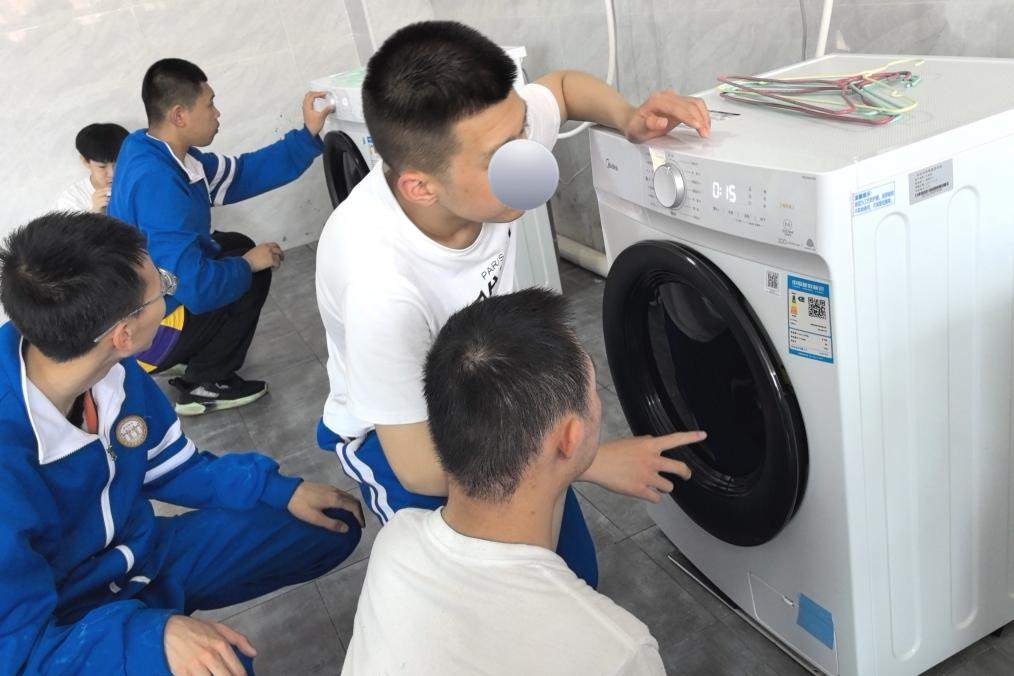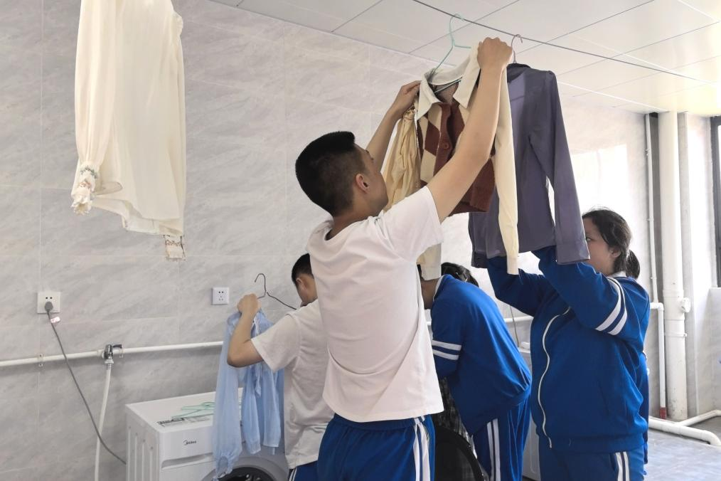 此次授课主要分为理论教学和实践操作两个环节。宋文颖先向学生讲解了清洗和晾晒衣物的基础知识,包括步骤、方法、注意事项等内容,实习队员负责提示学生关键步骤。掌握理论知识后,学生进入洗衣房进行实操练习,包括清洗衣物与晾晒衣物两个环节。清洗环节中,宋文颖组织学生分组将衣服放入洗衣机内清洗,并对插电源等安全问题进行强调。清洗完衣物后,学生分组晾晒衣物。罗曌玺与实习队员则负责辅助学生规范操作,引导学生正确找到衣服肩线并整理好衣领和拉链。
