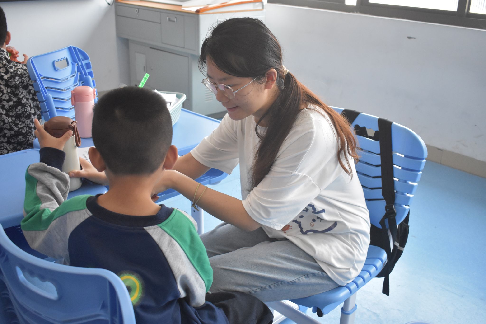 实习队队员们通过实际行动,深入了解学生,加深对特殊教育的理解和认识。在单人单考的班级,实习队队员耐心陪伴每一位学生。读题时,用简单清晰的语言,确保学生理解题意;学生答题速度慢,队员们便安静等待,适时给予鼓励。在统一发卷考试的班级中,实习队队员则时刻留意学生状态,一旦发现学生情绪波动,便及时安抚,帮助其调整状态专注答题。