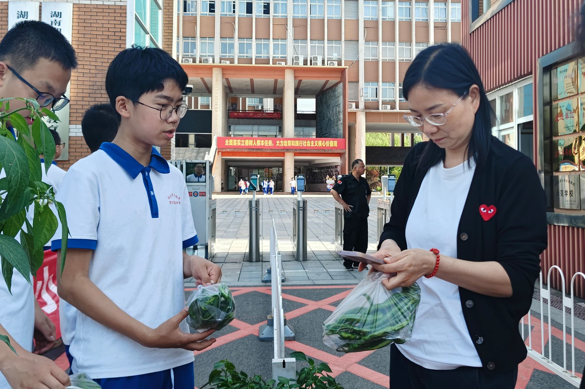 校领导与老师们纷纷到场支持,博才实验中学天顶校区执行校长罗爱斌带头扫码购买。实习队员王如心、栗萌协助维持秩序,黄婷婷则指导学生与顾客沟通。活动现场叫卖声、询价声此起彼伏,短短一小时,辣椒全部售罄。