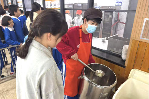 活动共分为餐前准备、就餐服务、餐后整理三个环节。在餐前准备阶段,实习队员指导学生进行桌椅摆放、餐具准备等工作,通过示范教学帮助学生掌握基础服务规范。就餐服务环节重点强化学生社交礼仪和服务技能培养,学生系统学习标准汤勺持握姿势,精准掌握200毫升盛汤量,并通过"微笑服务"等礼仪实践提升服务素养。餐后整理环节,师生协同完成餐具归集、桌面擦拭和地面清洁等任务。通过分步骤示范和实操训练,学生们逐步掌握了规范的清洁流程和方法,顺利地完成了最后的收尾工作。