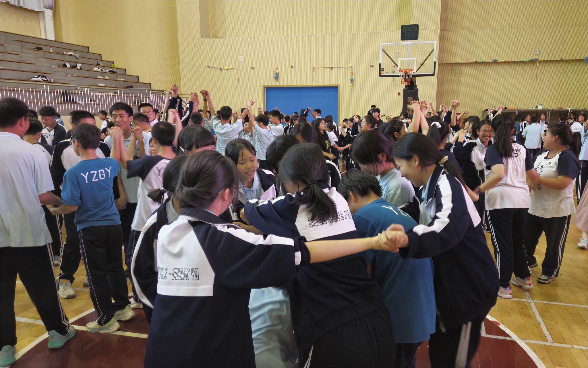 活动现场,多个趣味项目有序开展。在“数字集结号”游戏中,同学们围成大圈慢跑,主持人报数后,大家迅速抱团。现场气氛热烈,此游戏有效锻炼了同学们的反应速度和团队协作意识。“心有千千结”环节充满挑战,同学们手拉手围成圈,散开后重新握住原来的手形成“结”,再通过跨、钻等方式解“结”,极大提升了团队沟通协作能力。“车轮滚滚”项目里,学生分组制作“履带”并共同推动其向终点前进。过程中“履带”偶有断裂,同学们冷静修补,团队凝聚力得到提升。“气球接力”环节趣味十足,各小组用头、肩、膝盖传递气球,大家相互配合,展现出高度的默契。