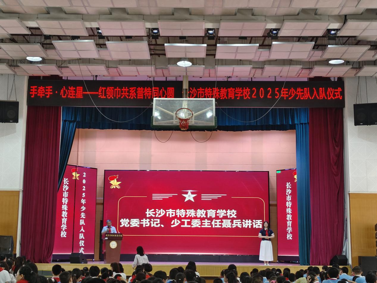 (通讯员 周烨 黄露漫)5月14日上午,教育科学学院2022级赴长沙市特殊教育学校实习队参加于艺体楼二楼举行的2025年少先队员入队仪式。长沙市特殊教育学校党委书记、校少工委主任聂兵,胡婷少先队名师工作室教师,麓山国际实验小学及特校少先队员代表、实习队员共同出席此次活动。