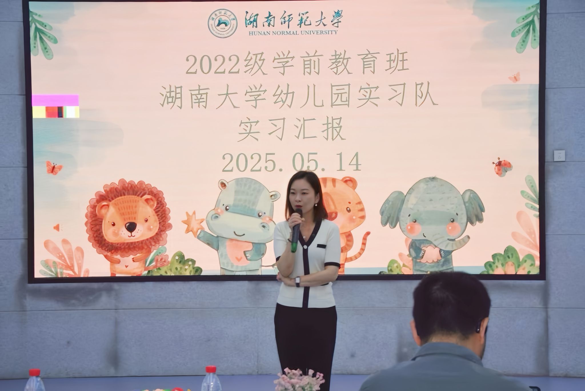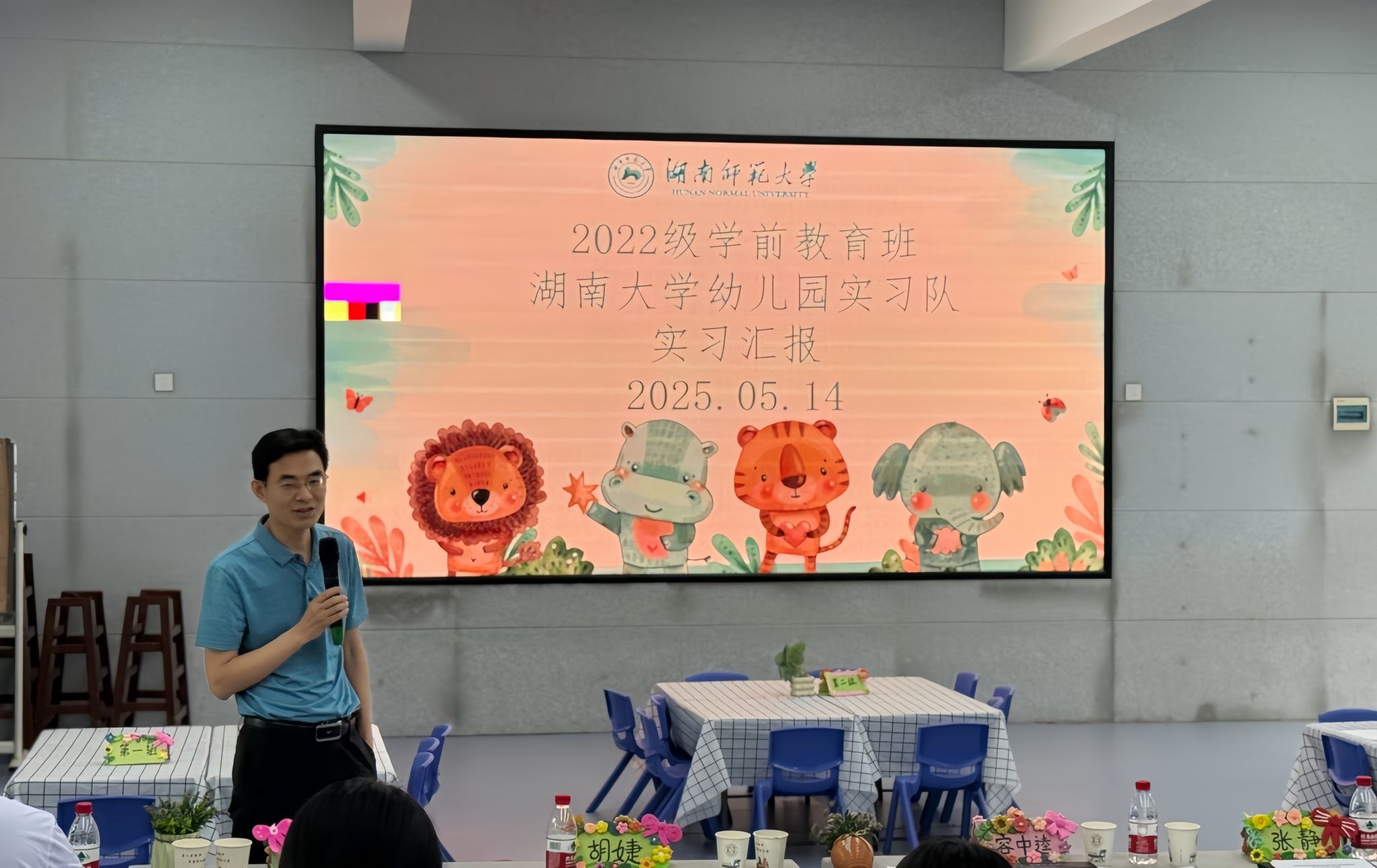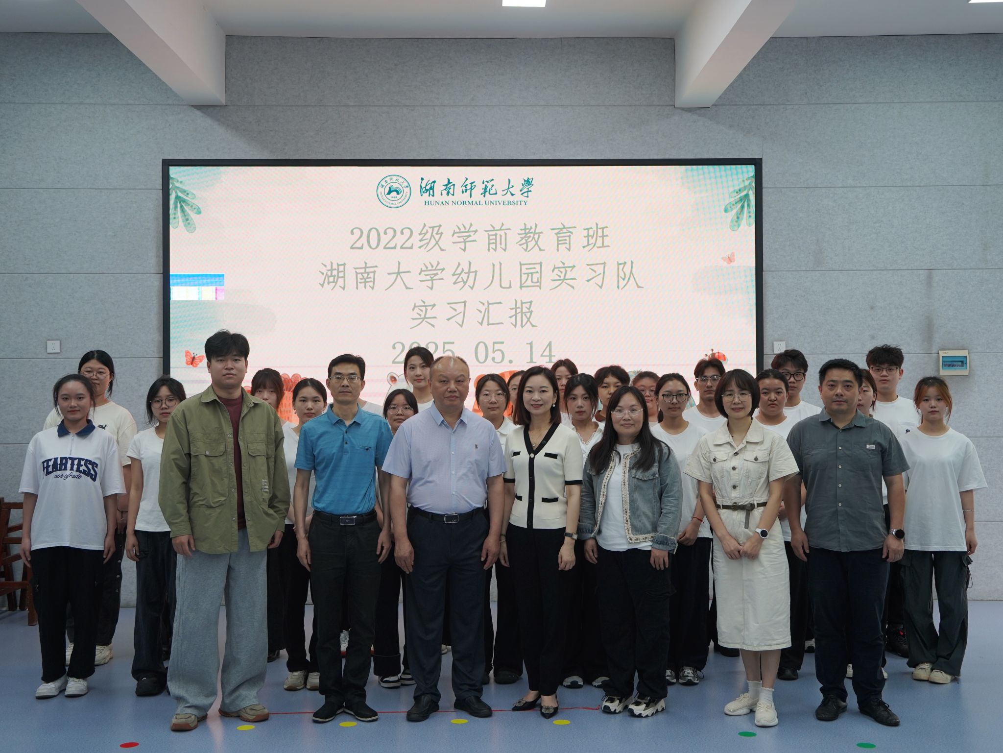 (通讯员 贺佳蓓 白丽娇)5 月 14 日上午,教育科学学院(以下简称“教科院”) 2022 级学前教育班实习汇报活动于湖南大学幼儿园顺利开展。本次实习汇报活动特邀湖南大学幼儿园园长张静、副园长胡婕等园方领导,以及教科院副院长容中逵、教务办主任李岱峰、教学督导教授曹中平、实习队指导老师康丹、张文洁、柳佳炜和2022级辅导员石新平亲临现场指导。