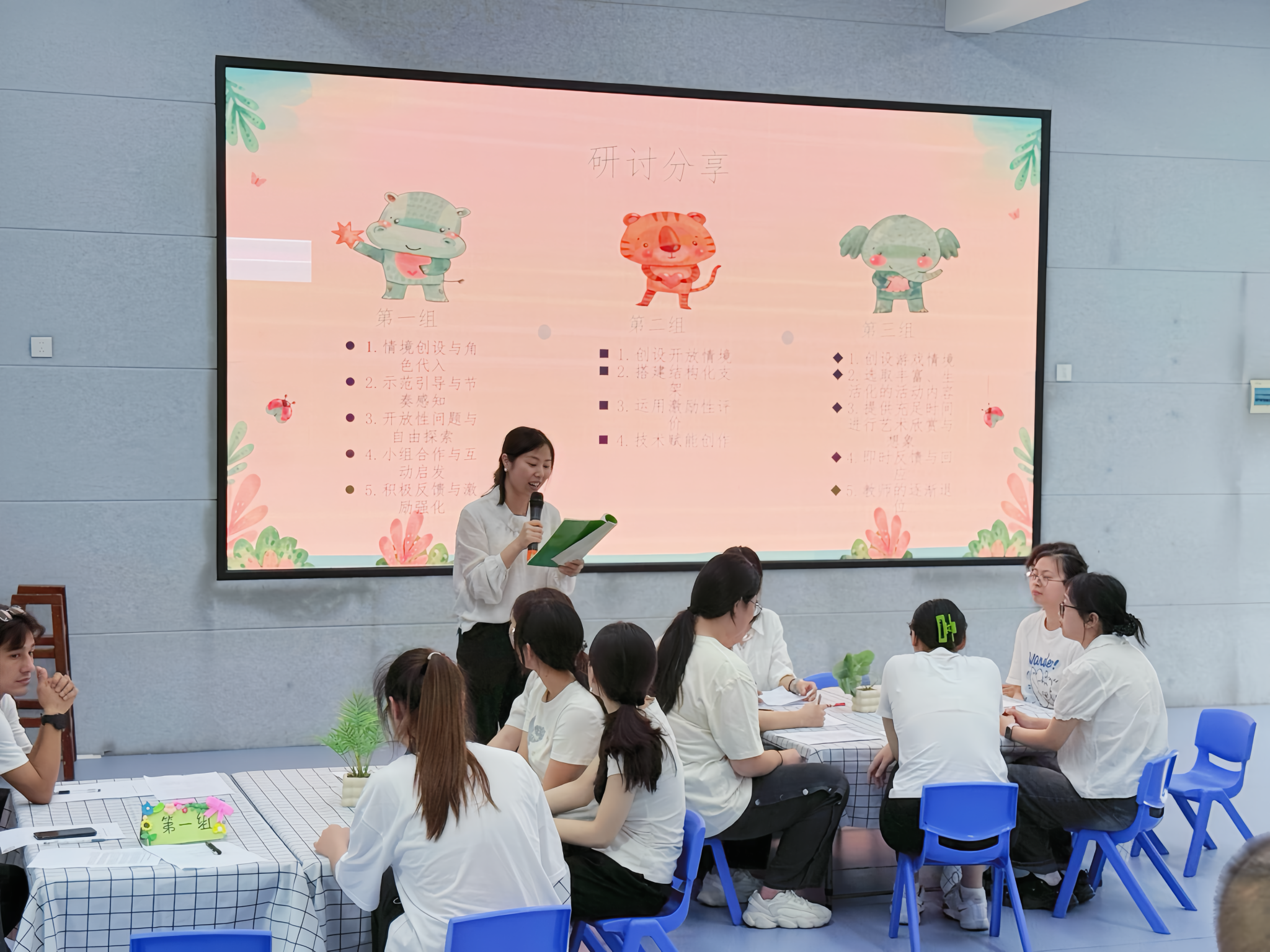 在说课反思环节,三位实习生代表诚恳剖析教学过程中的亮点与不足。全体实习生围绕 “集体教学活动中如何激发幼儿创意表达” 展开分组研讨环节,班主任与实习生各抒己见,小组代表分享成果,为教学实践提供新思路。