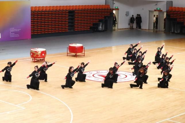 “教科教科,高奏凯歌!”比赛伊始,整齐响亮的口号从观众席上传来。同时,教科院代表队踏步来到中央并伴随着音乐的律动列出方阵。随后,教师队员石新平以挥剑开场,接着将队形过渡为三角状。鼓点渐密,队员们的舞姿也随之变幻,包括挥臂、点地、转身、下式等动作,彰显了教科学子的风采。队员们活力无限,元气满满,舒展张合间尽显积极昂扬的青春风貌。