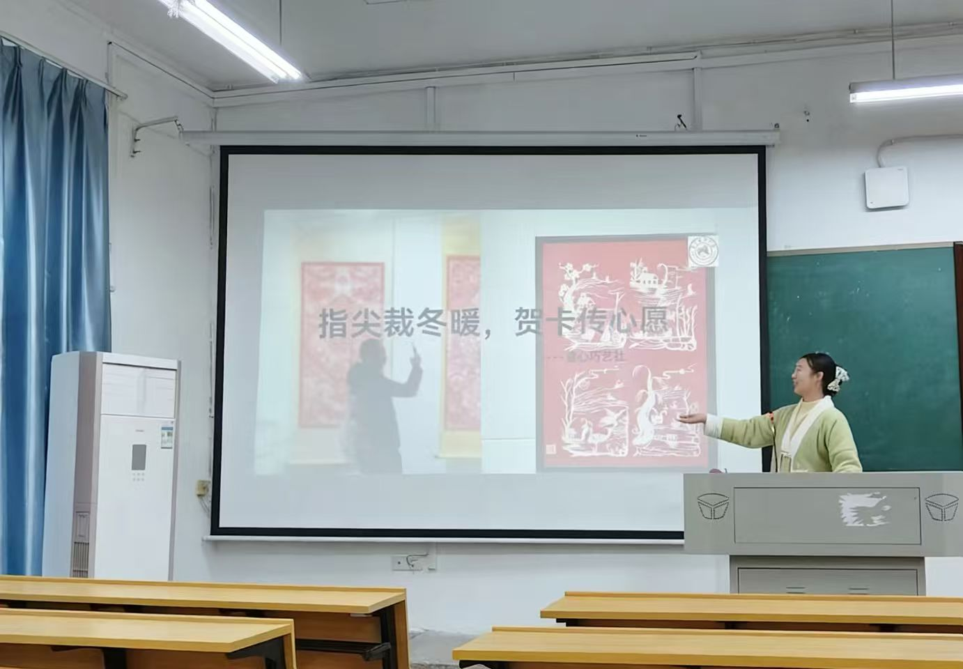 活动现场,剪纸、彩纸与空白贺卡被分发给每位参与者。同学们围桌而坐,或对照纹样细心裁剪,或自由创作个性图案,随后将精致的剪纸作品贴于贺卡封面,并在卡内写下对师长、朋友的暖心寄语。