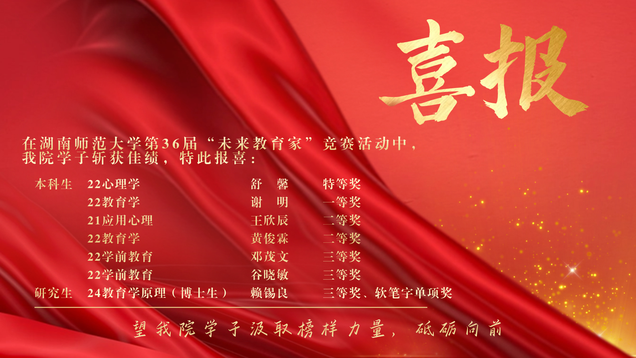 22级心理学舒馨获特等奖;22级教育学谢明获一等奖;21级应用心理学王欣辰、22级教育学黄俊霖获二等奖;22级学前教育邓茂文、谷晓敏获三等奖;24级教育学原理博士生赖锡良获三等奖、软笔字单项奖。